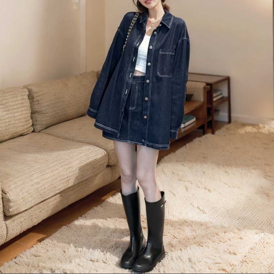 ゆったりとしたデニムシャツとミニスカートのセットアップです。