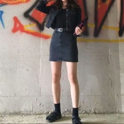 クロップド丈のデニムジャケットとスカートを組み合わせた、スタイリッシュなセットアップです。