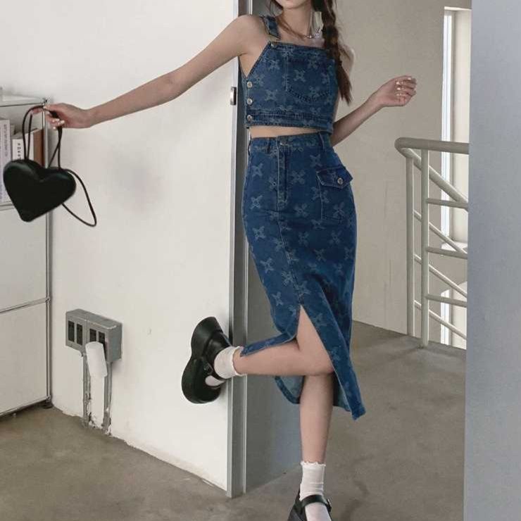 十字柄デザインのデニムビスチェとミディスカートのセットアップ
