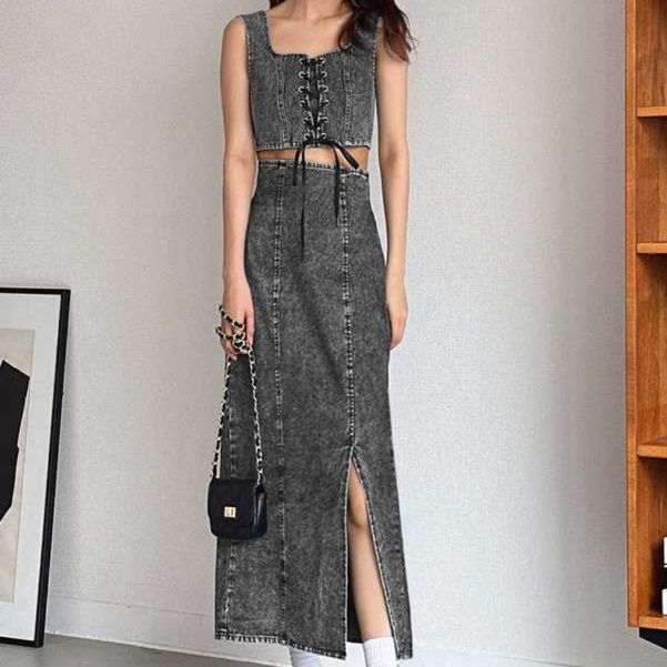 レースアップデザインのデニムビスチェとマキシスカートのセットアップ