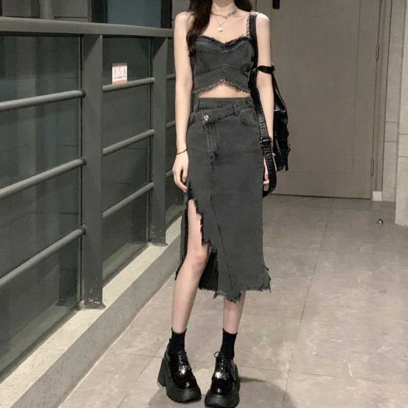 フリンジ加工が魅力のデニムビスチェとスリットスカートのセットアップ