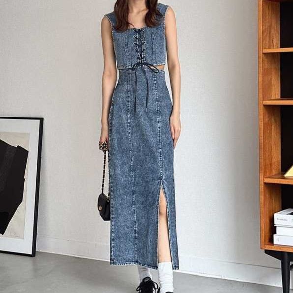 紐結びデザインのデニムビスチェとロングスカートのセットアップ