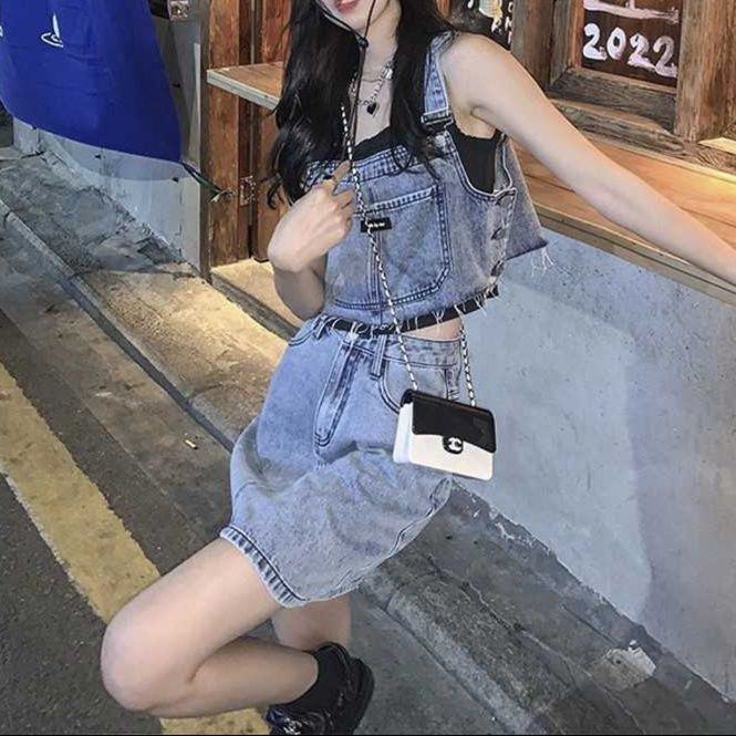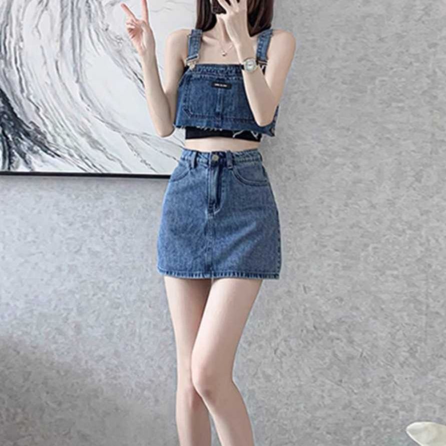カットオフデザインのデニムビスチェセットアップとスカート