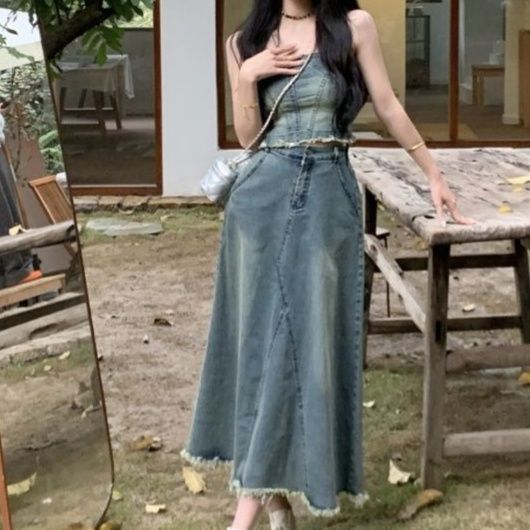 裾フリンジが魅力のデニムビスチェとロングスカートのセットアップ