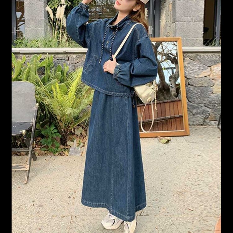 はんなりとした雰囲気が魅力のデニムプルオーバーとロングスカートのセットアップです。