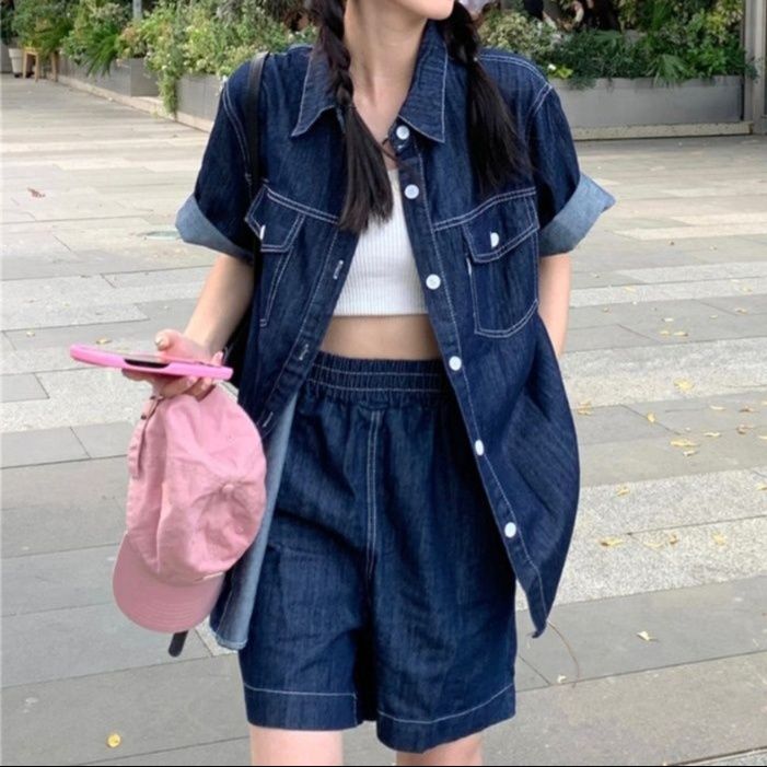 ゆったりシルエットの半袖デニムシャツとショートパンツセットアップ