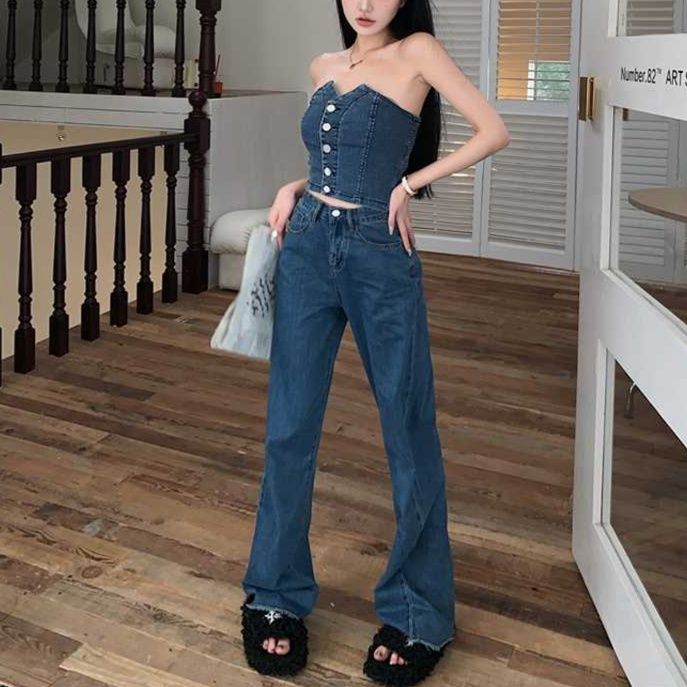 ハイウエストのビスチェとワイドパンツを組み合わせたジーンズのセットアップです。
