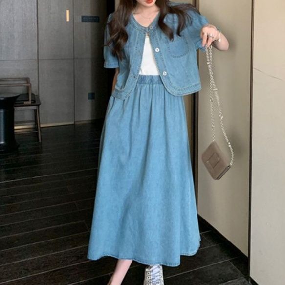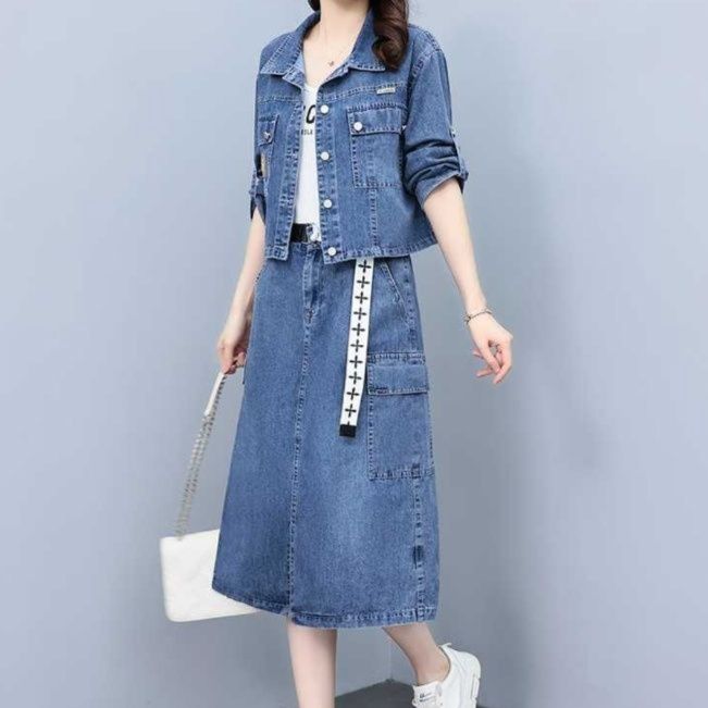 伝統的なジャパンブルーの色合いが魅力的なジャケットとスカートのジーンズセットアップです。