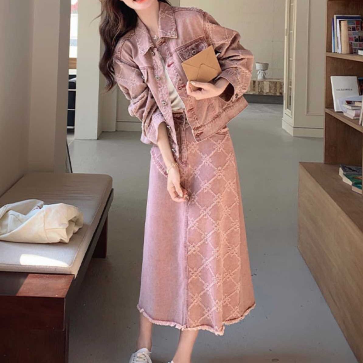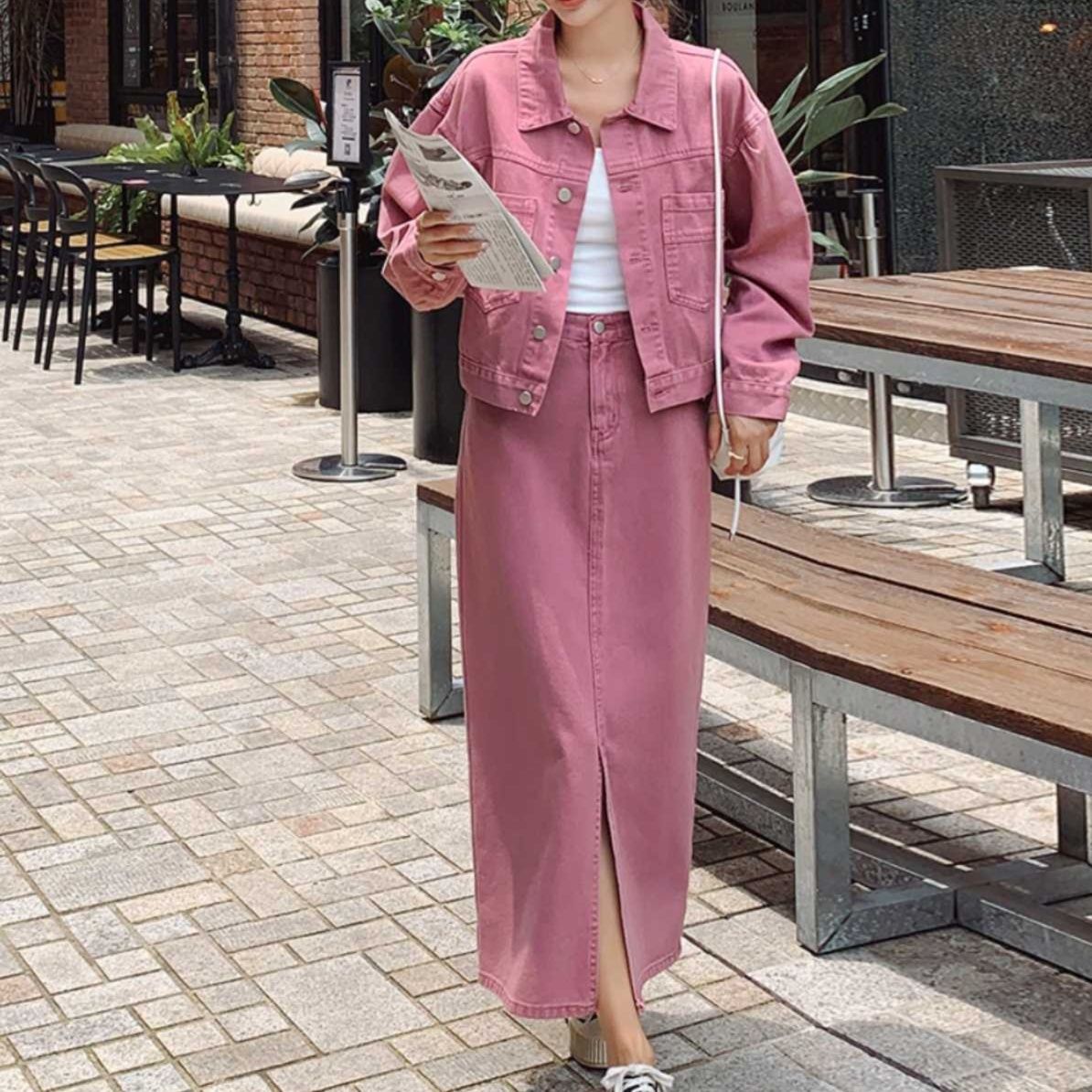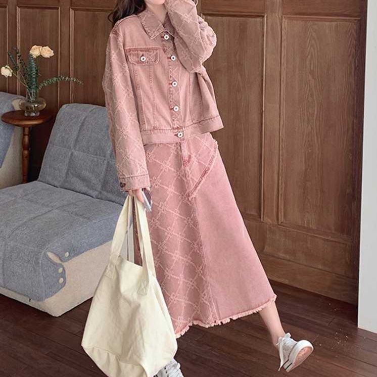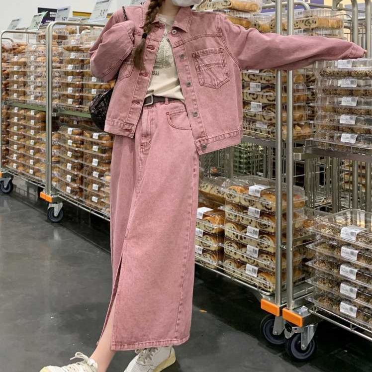 ピンクデニムセットアップ ゆったりシルエットのジャケットとロングスカート