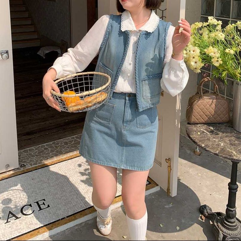 クラシカルなデザインのデニムベストとミニスカートが組み合わされたセットアップです。