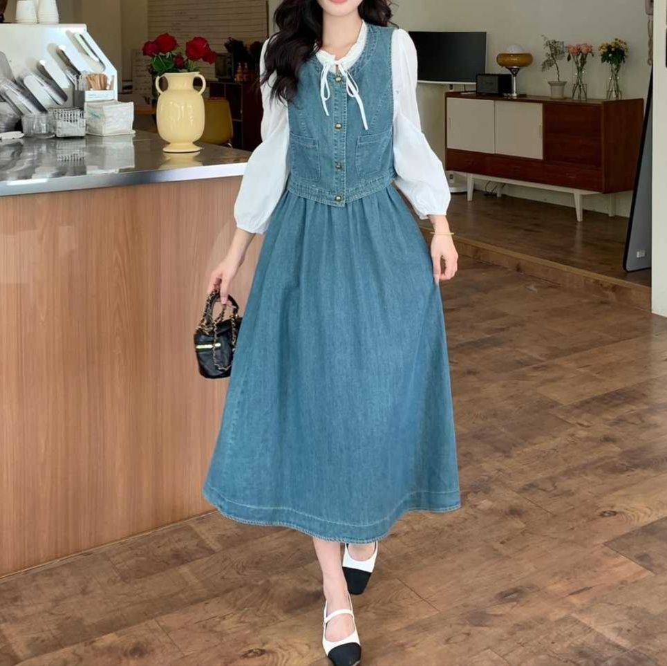 デニムの風合いを活かしながら、ベストとスカートのバランスが絶妙な一着となっています。