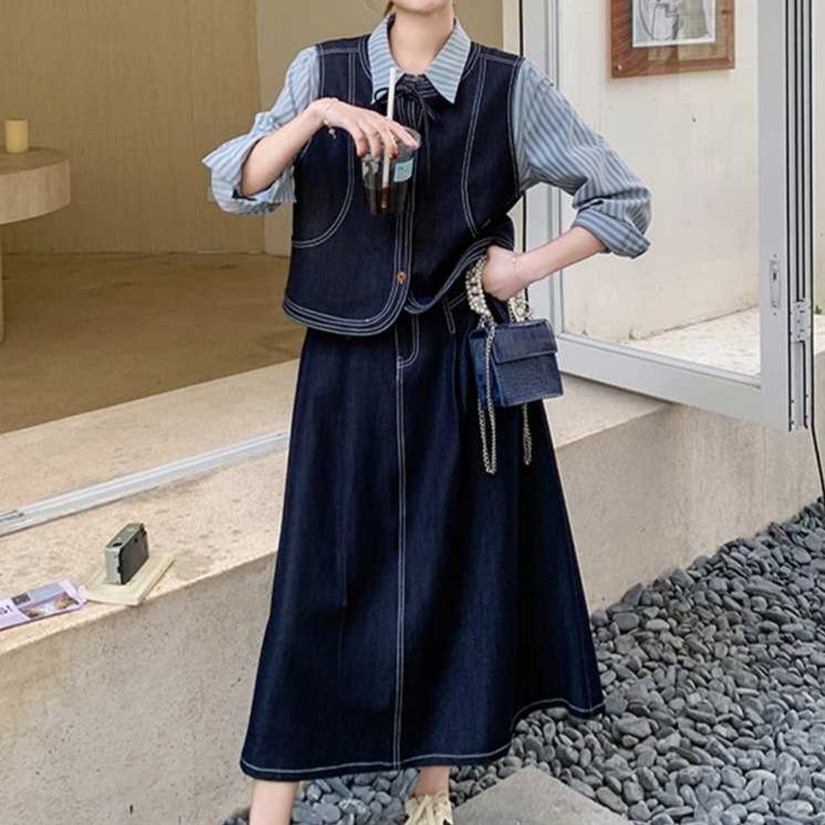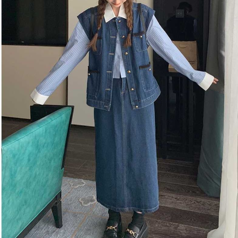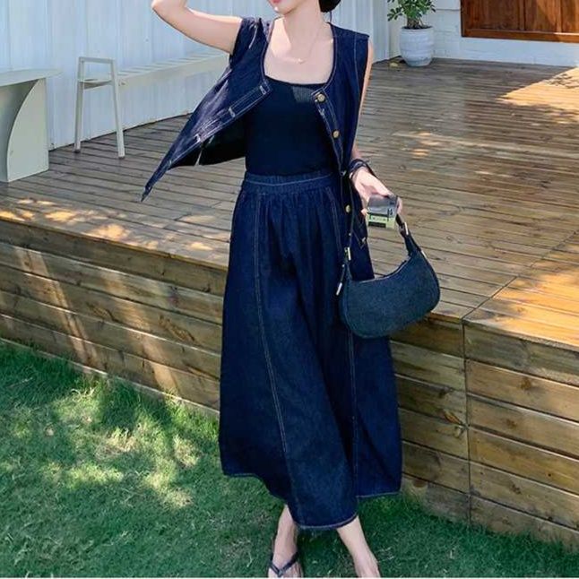 袖なしのすっきりとしたデニムベストと、ゆったりとしたロングスカートが魅力的なセットアップです。