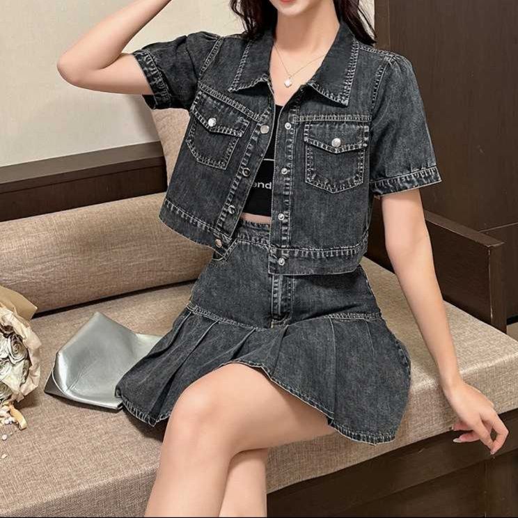 クロップド丈のジャケットとミニスカートの組み合わせが新鮮なブラックデニムセットアップです。