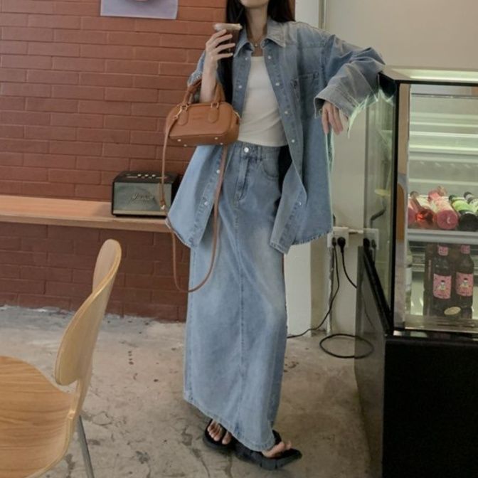 デニムオンデニムで上級者が魅せるゆったりシャツ×ロングスカートのおしゃれな二点セット