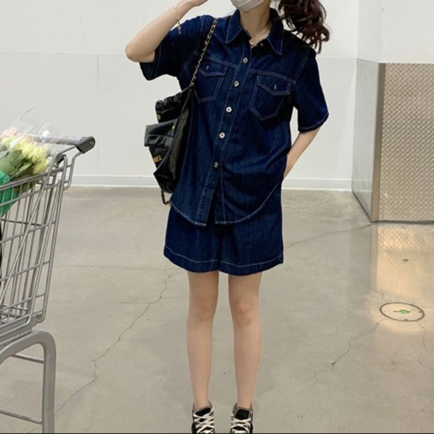 ゆったりとしたデニムシャツとショートパンツがセットになった、夏の定番セットアップスタイルです。
