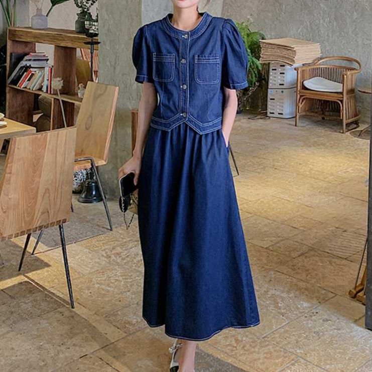 スカートとのセットでデニムオンデニムの統一感を演出しながら、パフスリーブのデザインが個性的なアクセントになります。