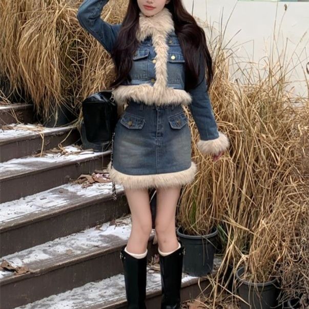 冬のデニムオンデニムに華やかさを添えるファー装飾短丈ジャケット×ミニスカートセット