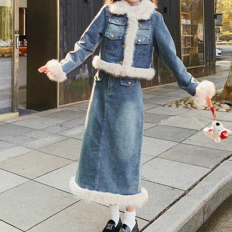 冬のデニムオンデニムを暖かく包むふわもこファー縁取りジャケット×ロングスカートセット