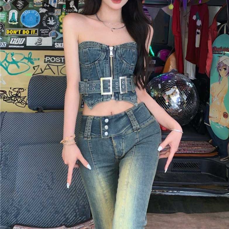 デニムオンデニムアメカジハードベルト付きビスチェのセットアップ