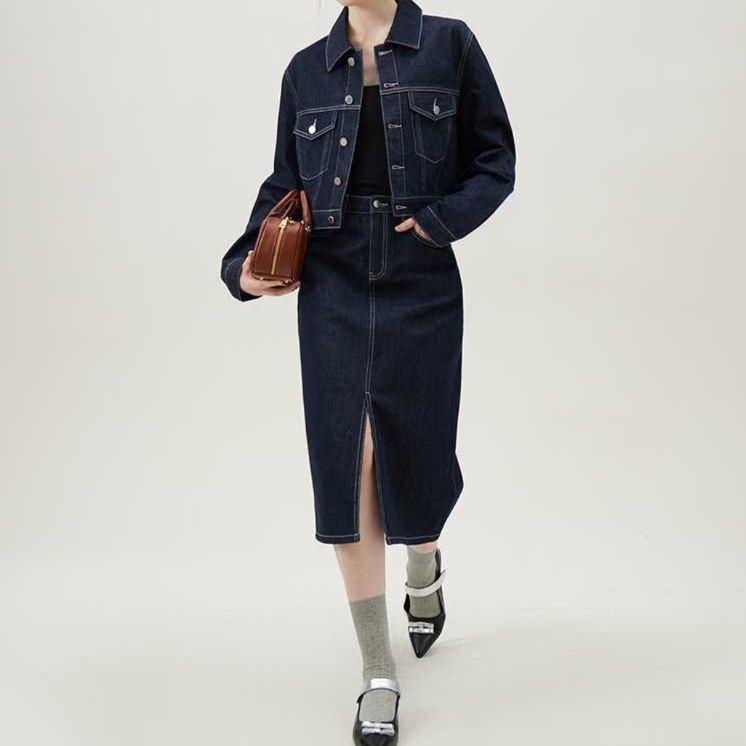 リジッドデニムセットアップ ロング丈スカートとジャケットのエレガントな組み合わせ