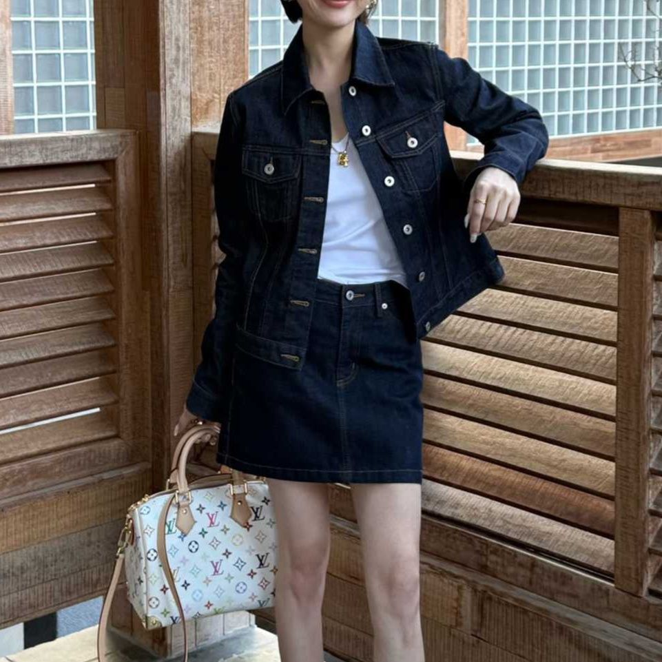 クラシカルなデザインのミニスカートとジャケットを組み合わせたリジッドデニムセットアップです。