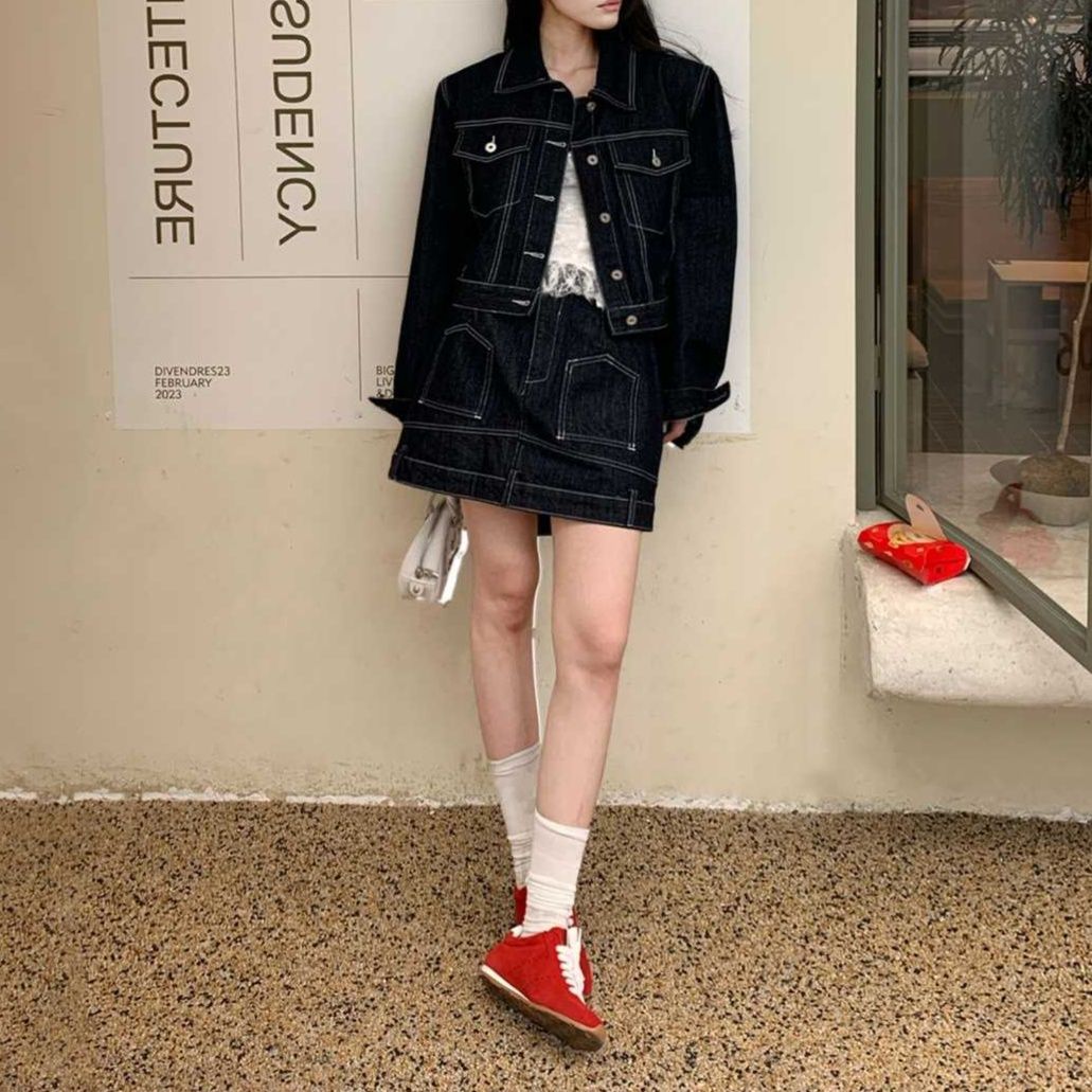 リジッドデニムセットアップ 配色ステッチが印象的なジャケットとミニスカートの組み合わせ