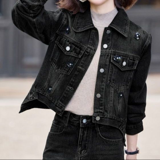 デニム生地に散りばめられた黒い花モチーフが、カジュアルな中にも可愛らしさをプラス