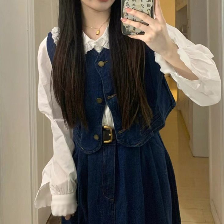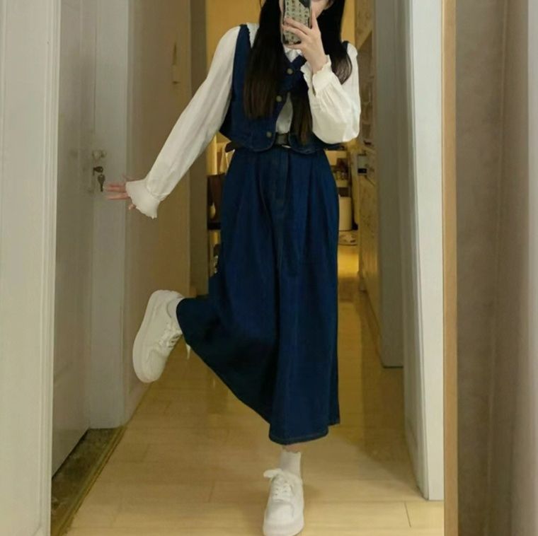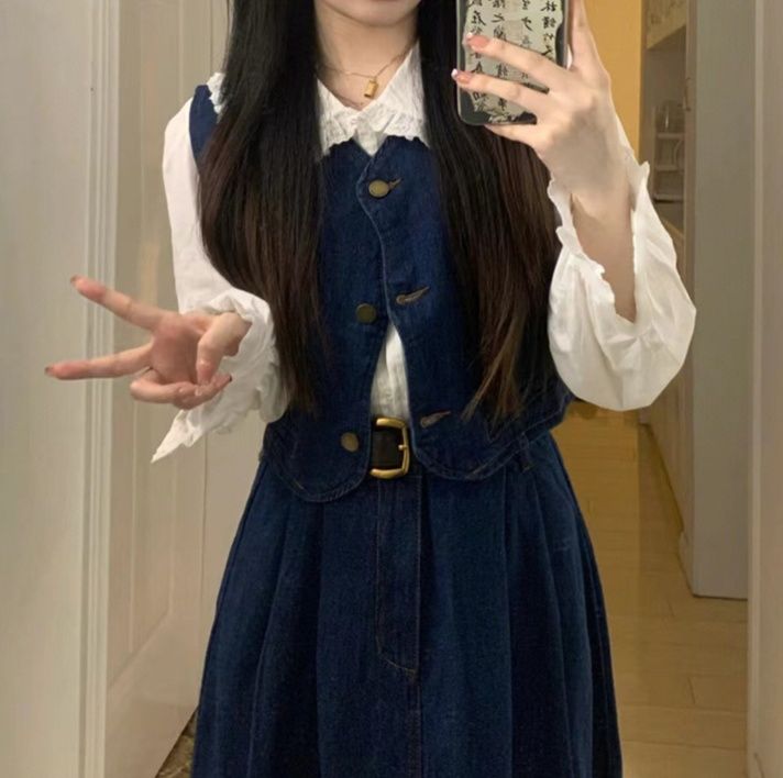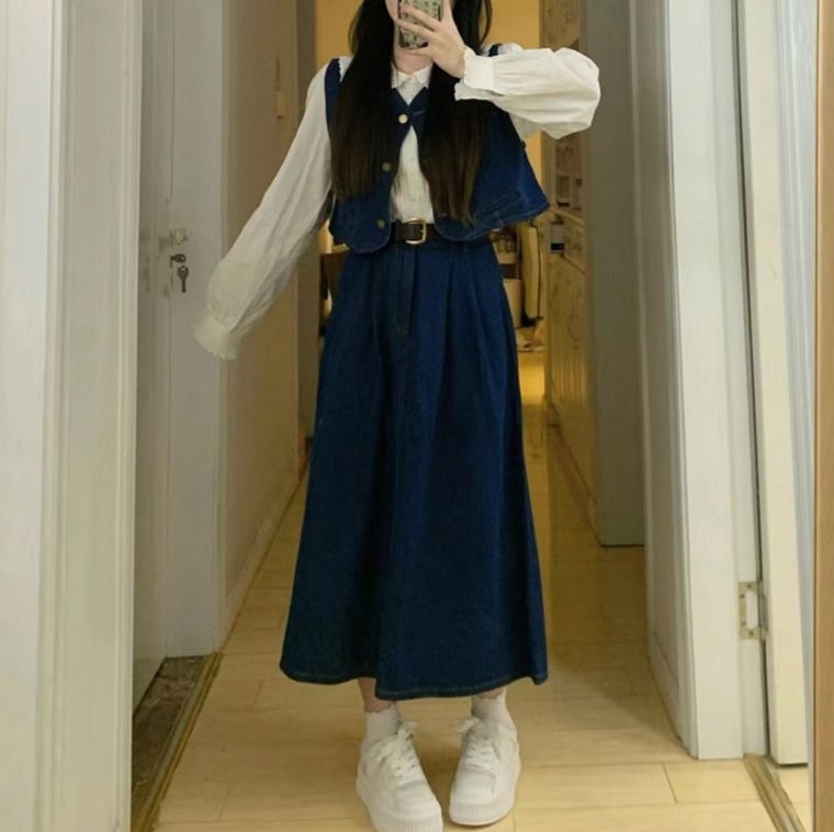 クラシカルな魅力が漂うデニムセットアップ。前ボタンのベストとフレアな広がりのあるロングスカートの上品な組合せです。