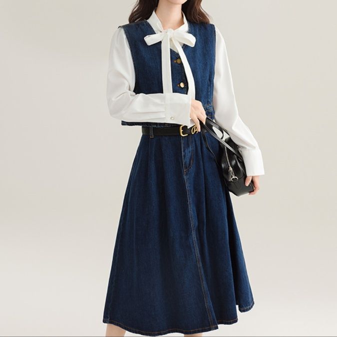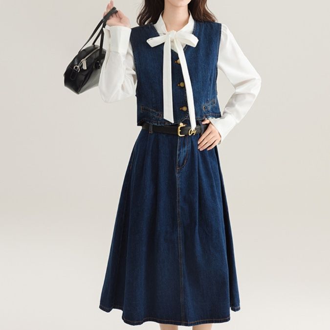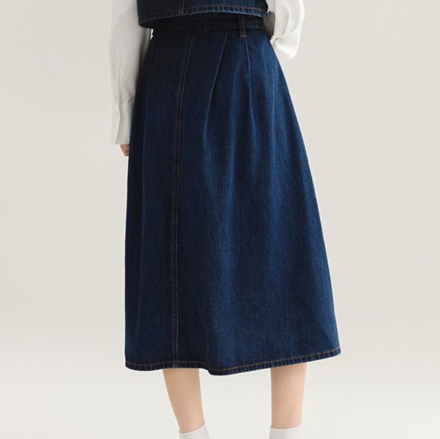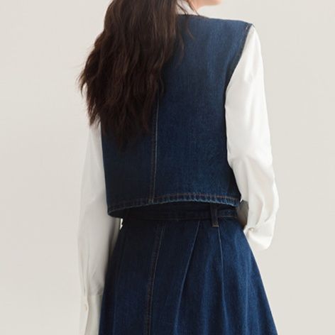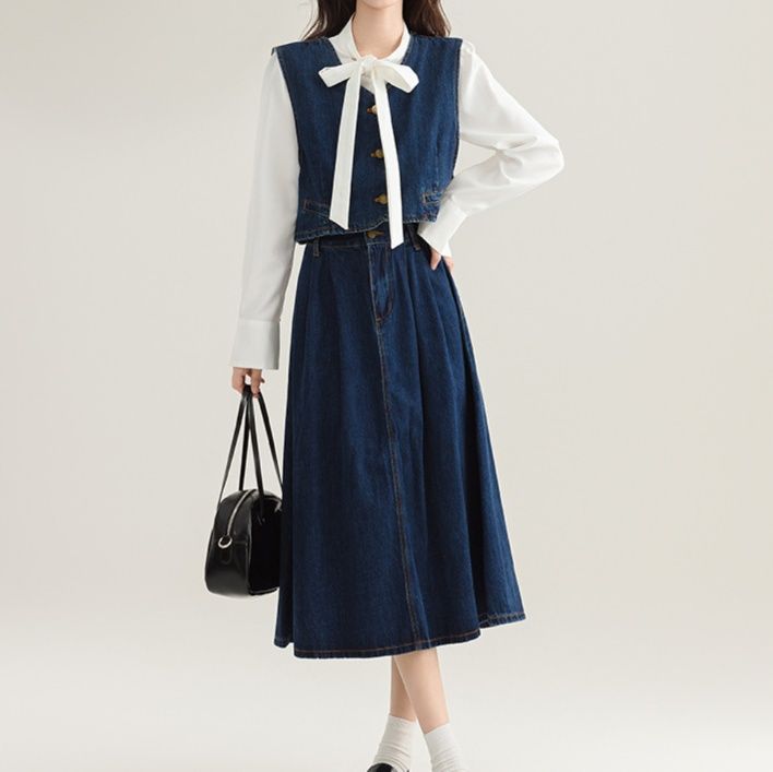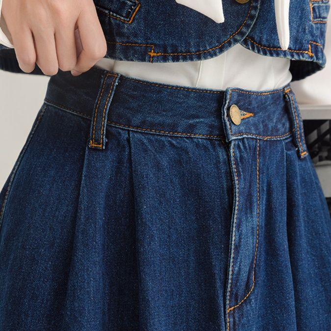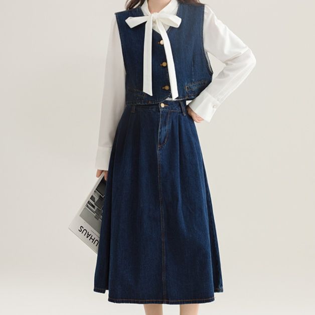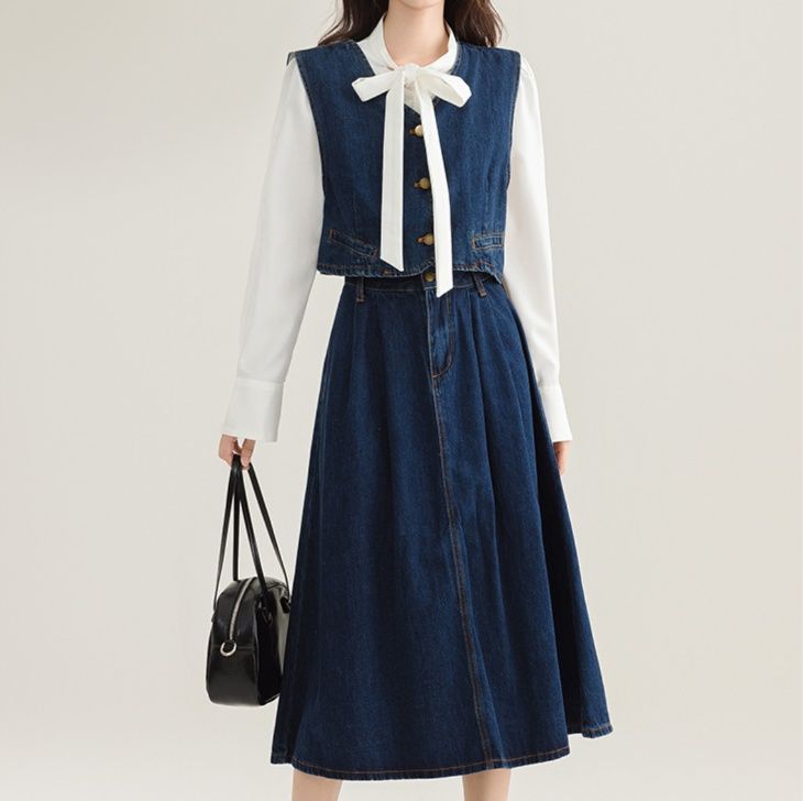 上品な印象を与えるデニムセットアップ。品のあるボタン付きベストと、ふんわりとしたミディ丈のフレアスカートの組み合わせです。