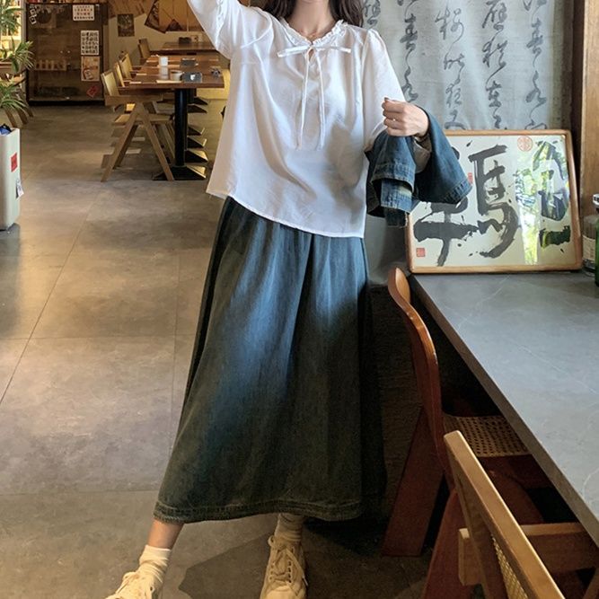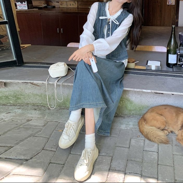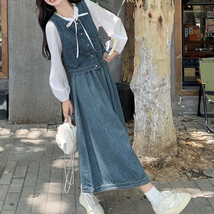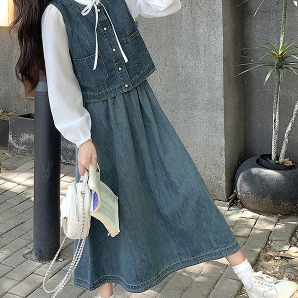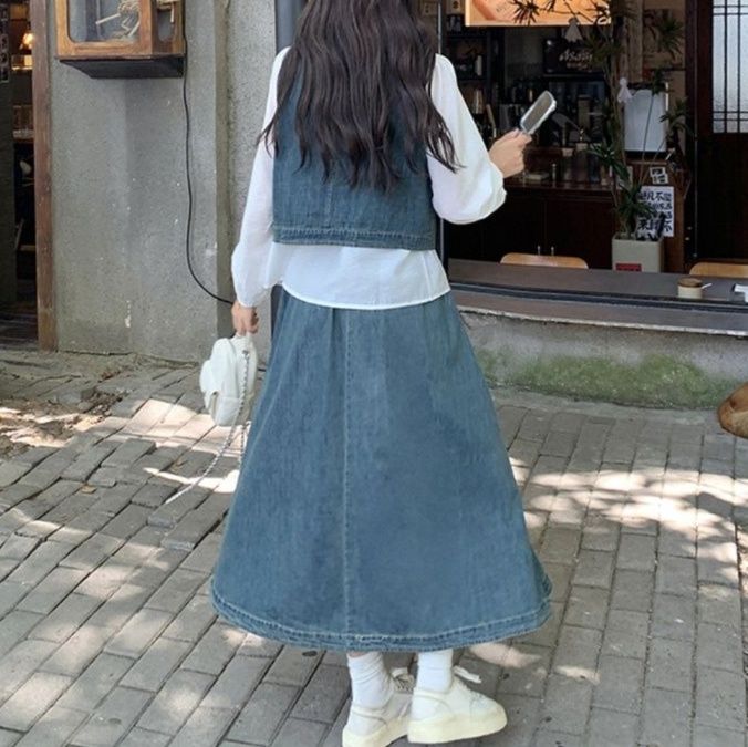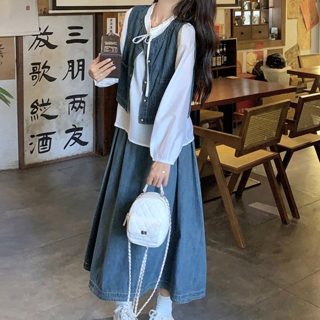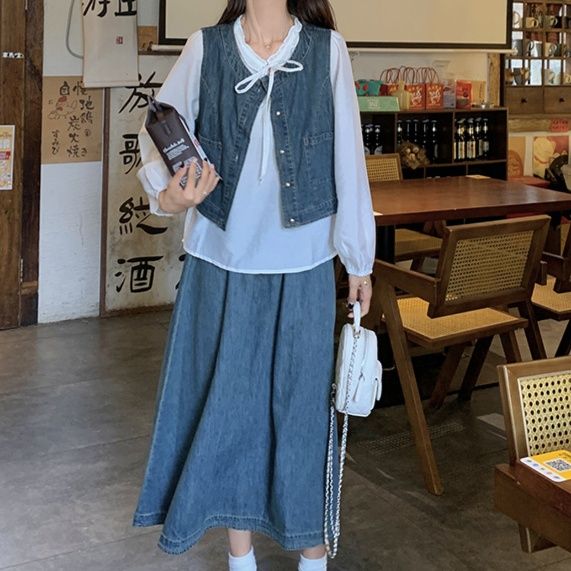 デニムセットアップの新作が登場。上品な白ブラウスとベスト、ロング丈スカートの組み合わせ。