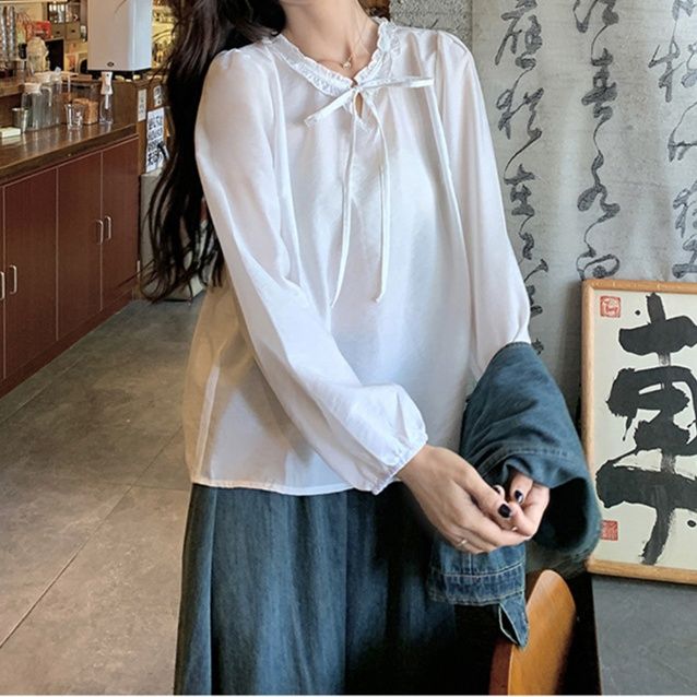 白の長袖ブラウスが優しい印象を演出し、デニムコーデに女性らしさをプラス