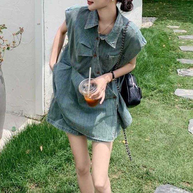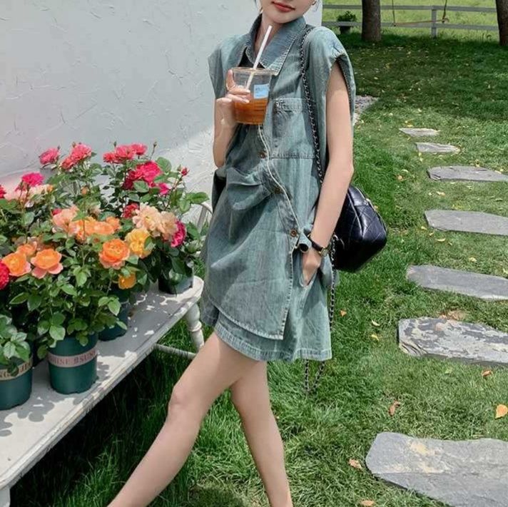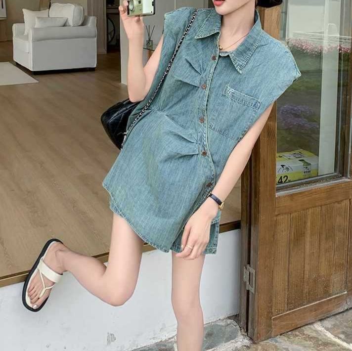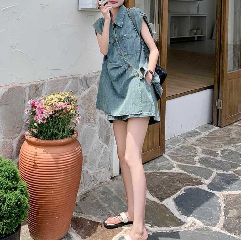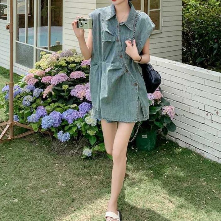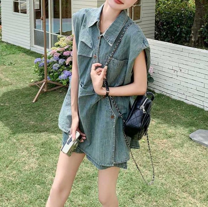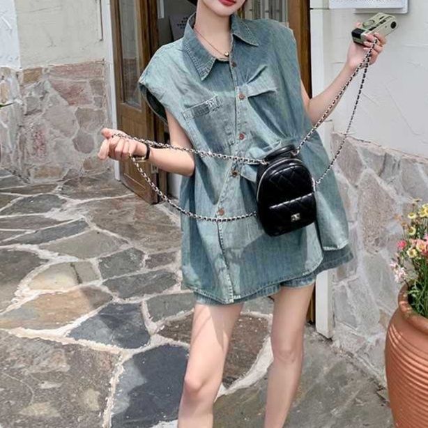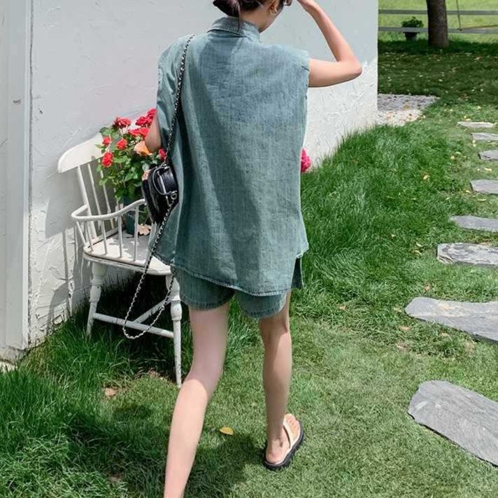 胸ポケット付きのノースリーブシャツとショートパンツの組み合わせで、夏の装いに最適なシャツセットアップです。