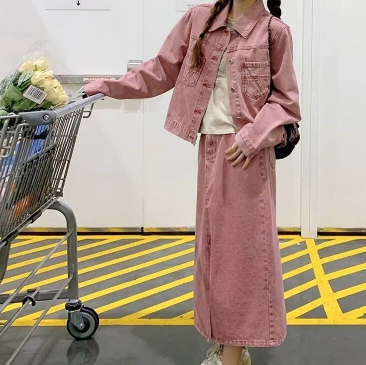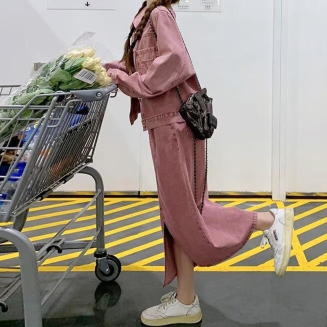 同素材のジャケットとスカートの組み合わせで統一感のある着こなしを実現