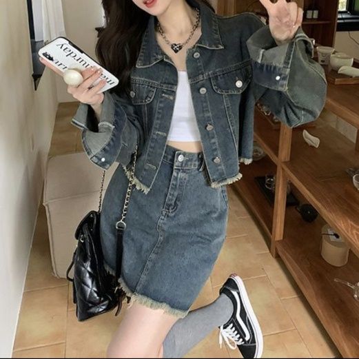 短めの丈感が魅力のジャケットと裾フリンジのミニスカートの組み合わせが、こなれた雰囲気を演出します。