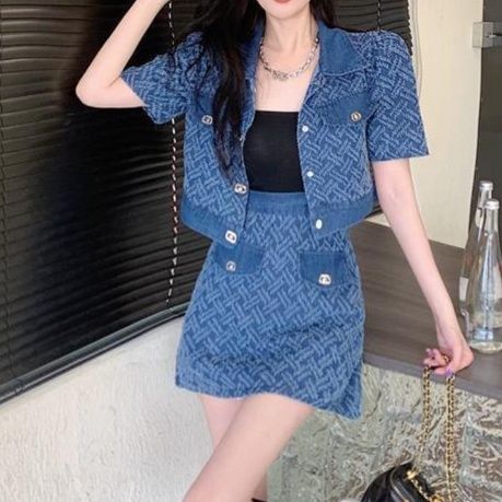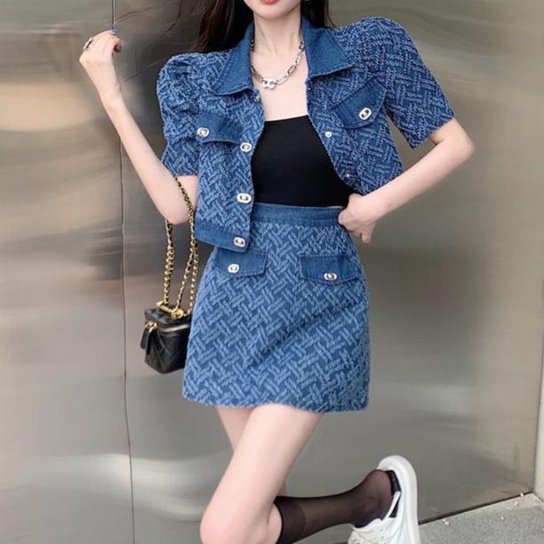 半袖ショート丈ジャケットとミニスカートのデニムセットアップです。