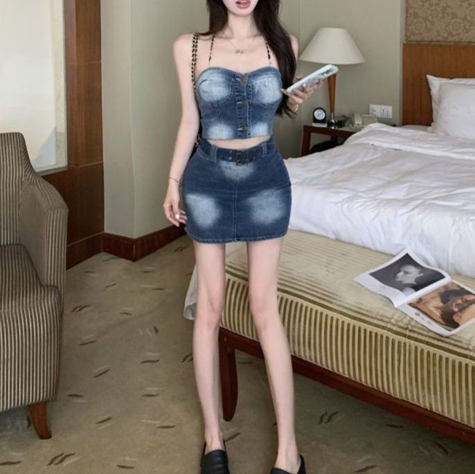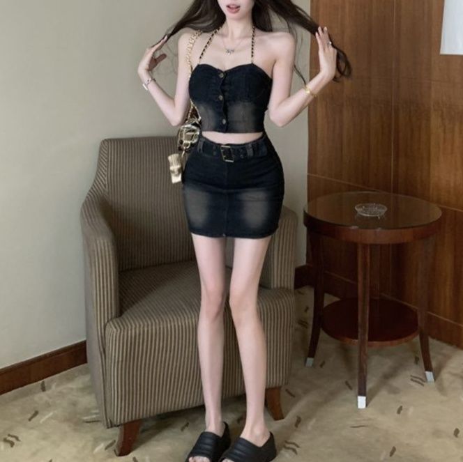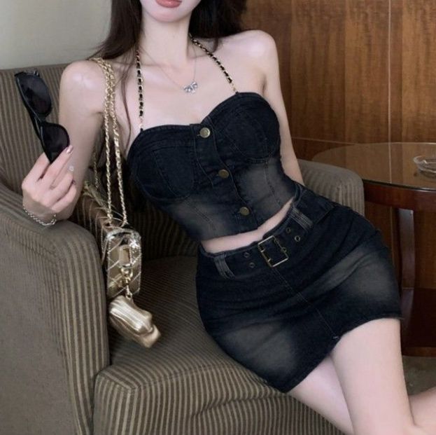 洗練されたデザインが魅力のデニムセットアップ。フロントボタンがアクセントのチューブトップと、タイトミニスカートが絶妙なバランスを生み出します。