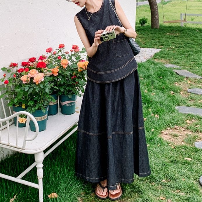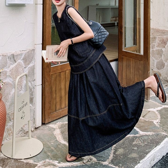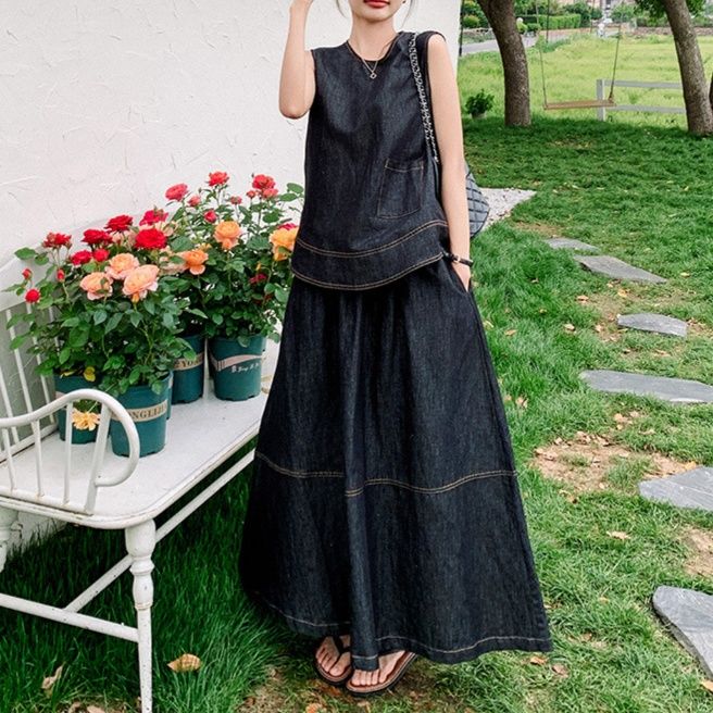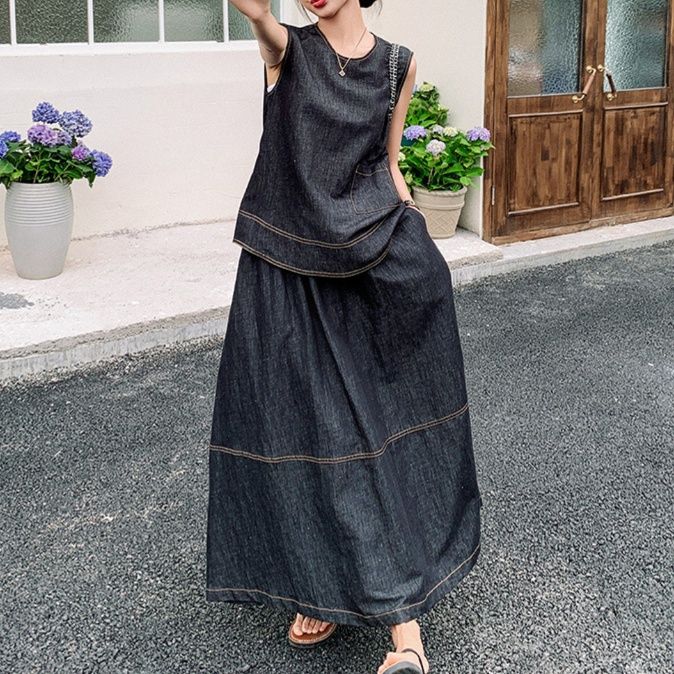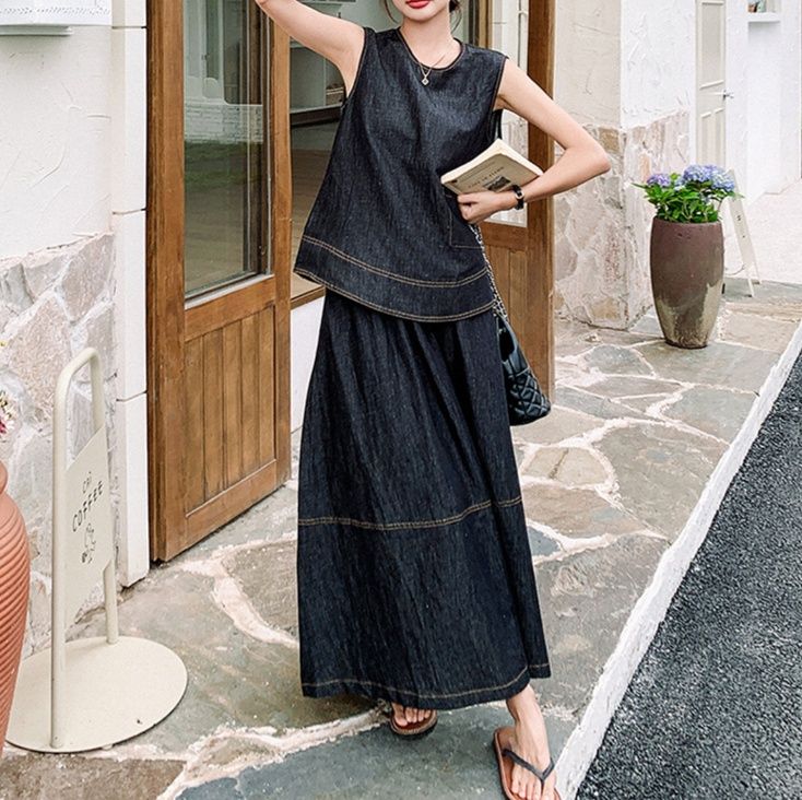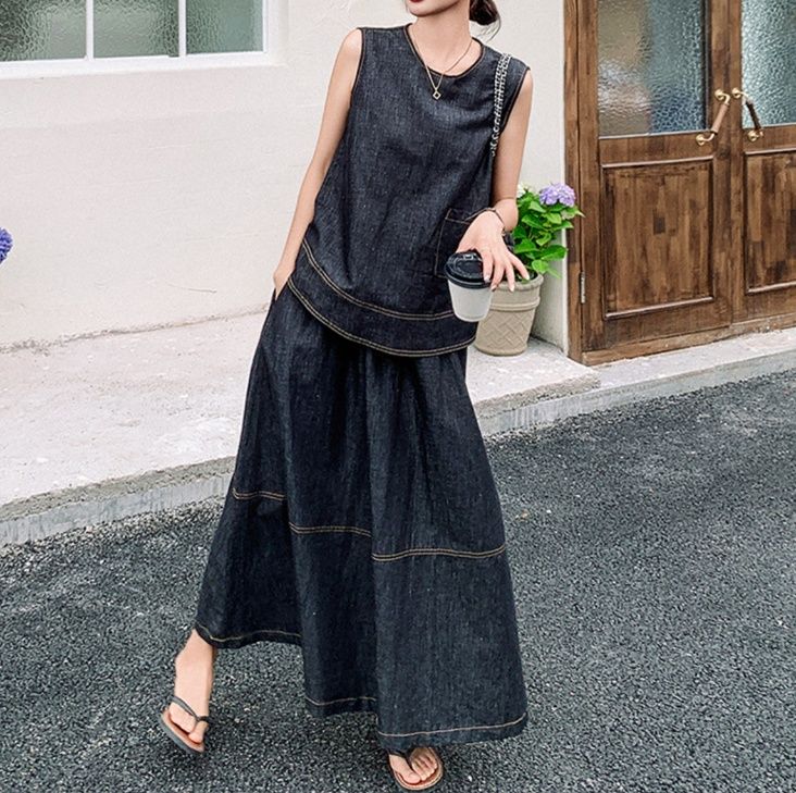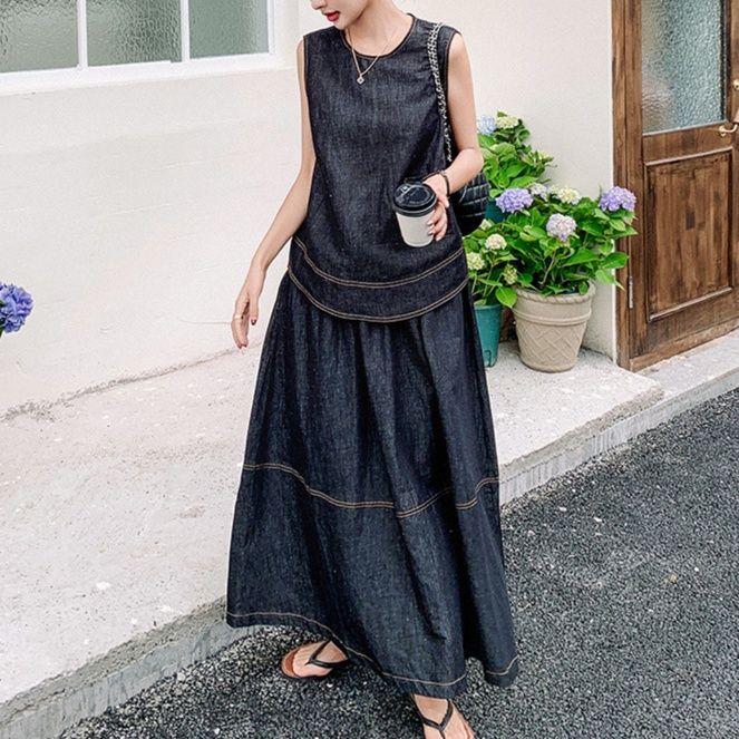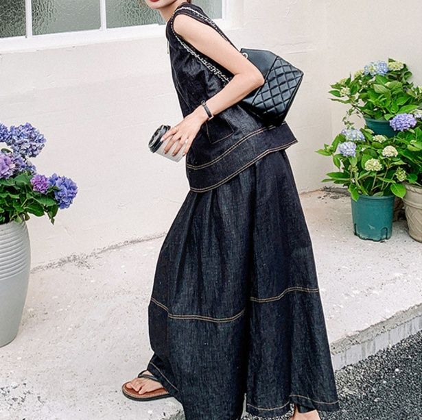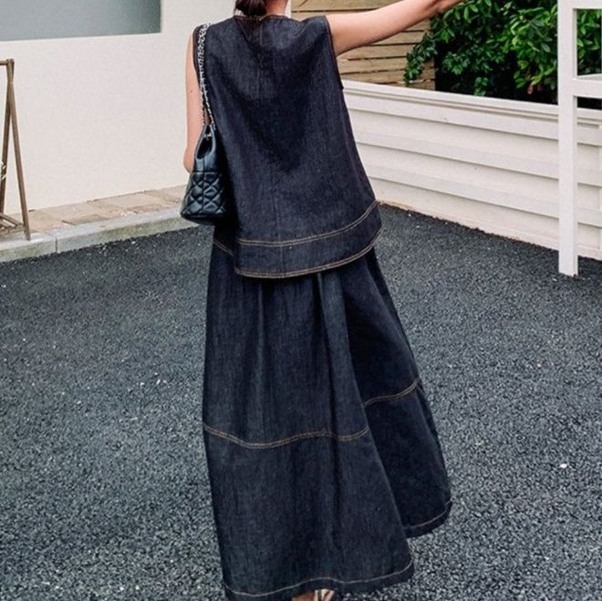 ノースリーブのゆったりトップスと広がりのある長めのスカートが特徴的なスカートセットアップです。