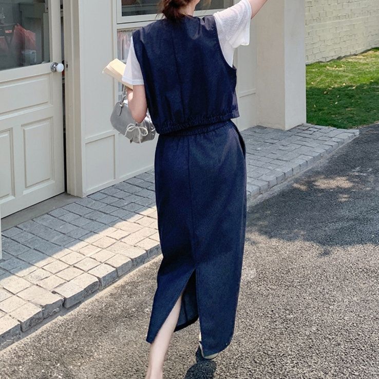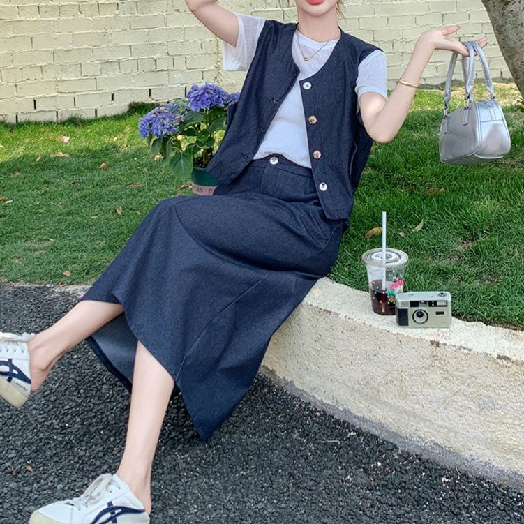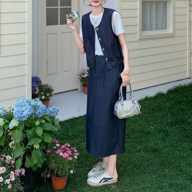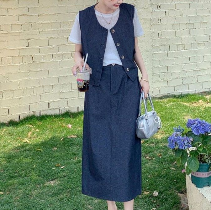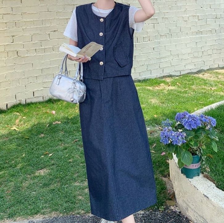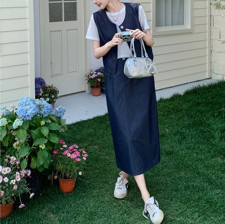上品な雰囲気漂うデニムセットアップ。前ボタン仕様のノースリーブベストとミディ丈のすっきりとしたスカートの組み合わせです。
