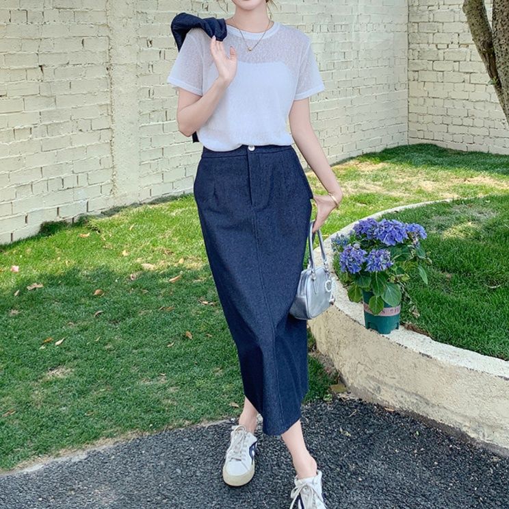白いTシャツとの相性も抜群で、カジュアルながらも品のあるスカートセットアップに仕上がっています。