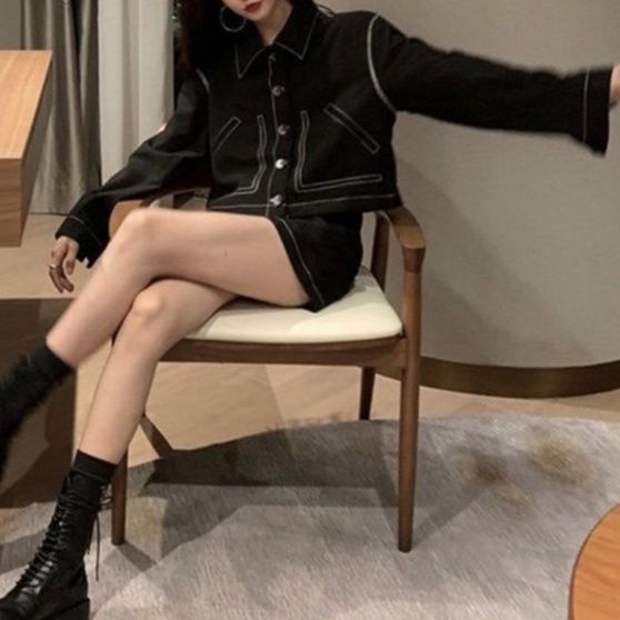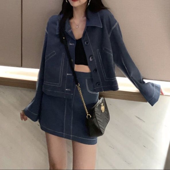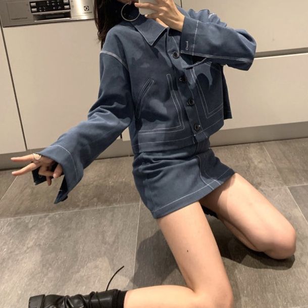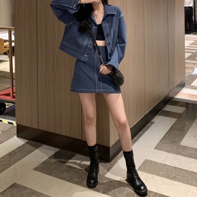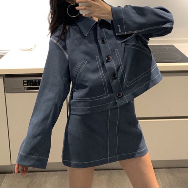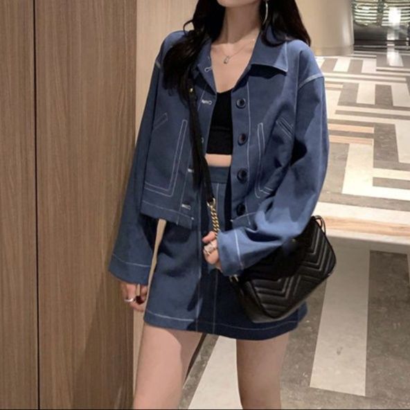 デニムセットアップならではの洗練された縫製技術が光るジャケットとミニスカートのセット。