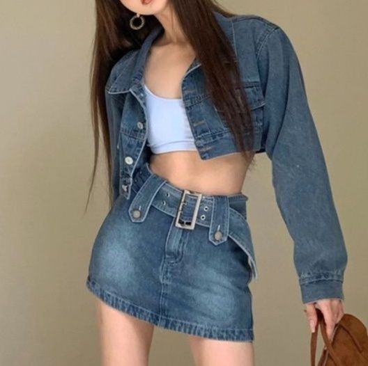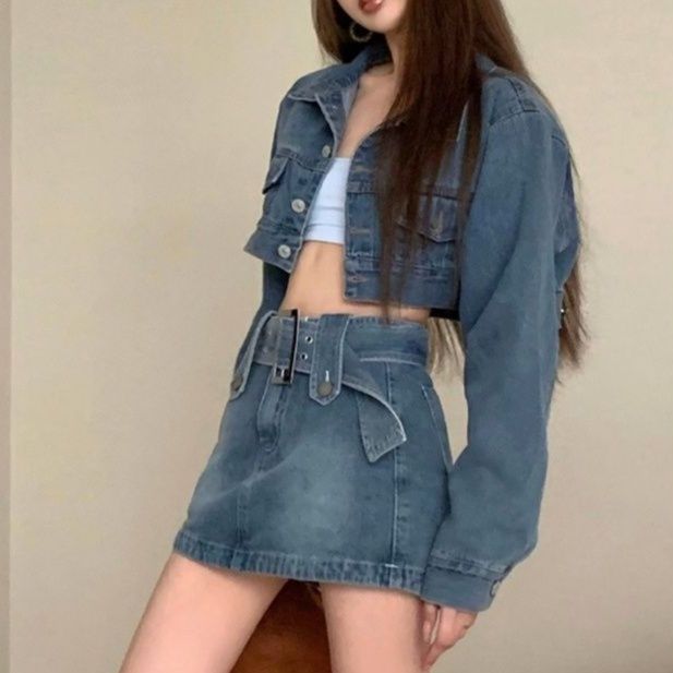 トレンド感あふれるデニムセットアップの短丈ジャケットとベルト付きミニスカートのセット。