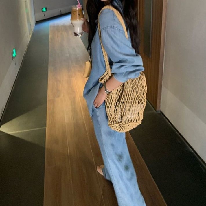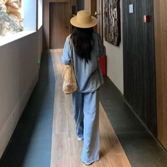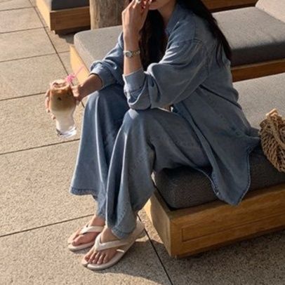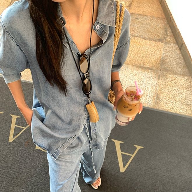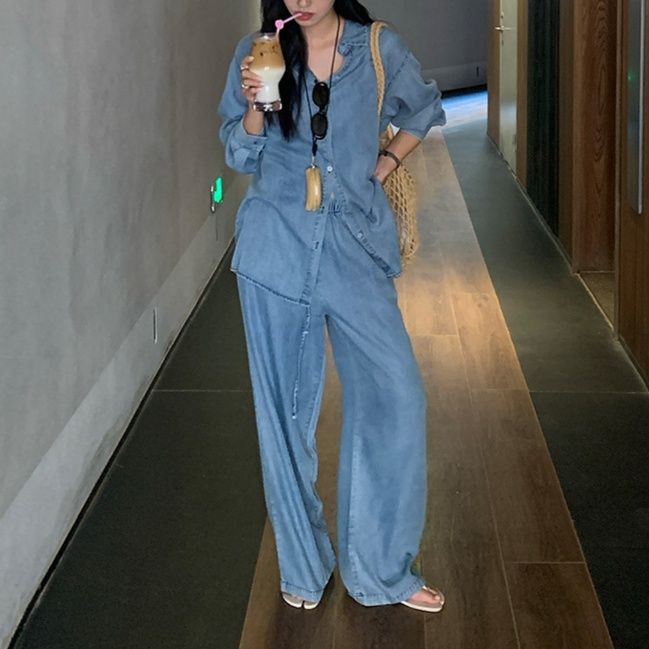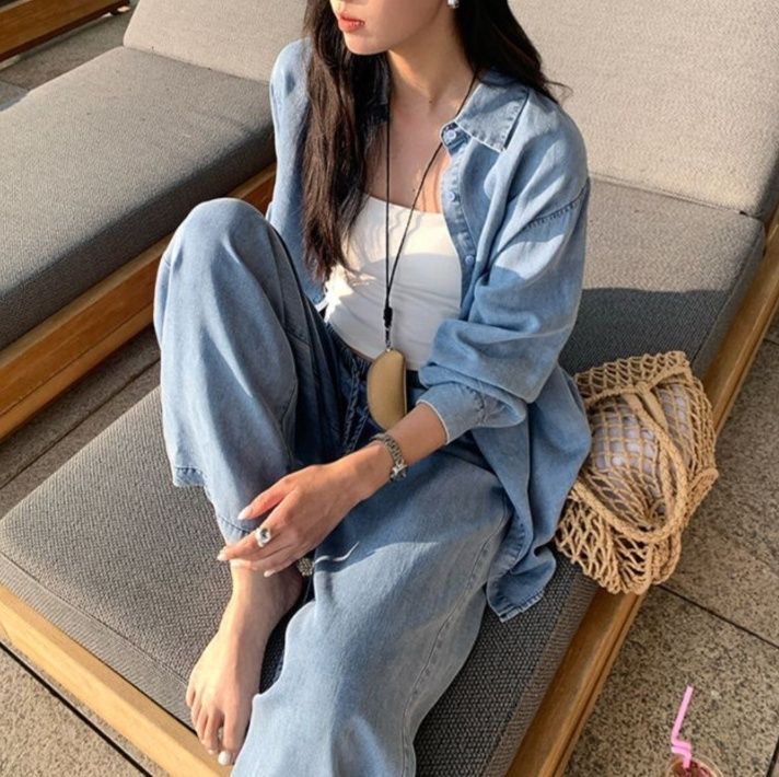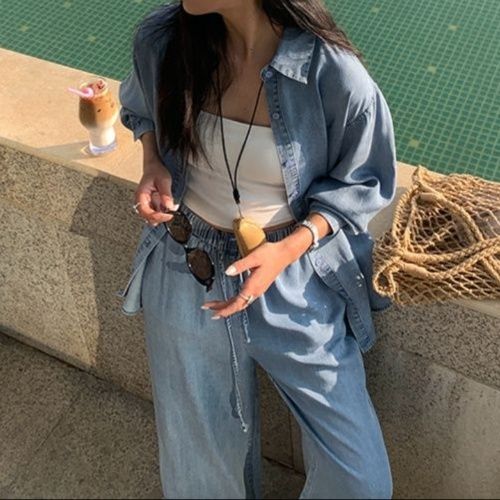 爽やかな着心地のデニムセットアップ。ワイドシルエットのパンツと長袖シャツの組み合わせで、こなれた雰囲気を演出します。