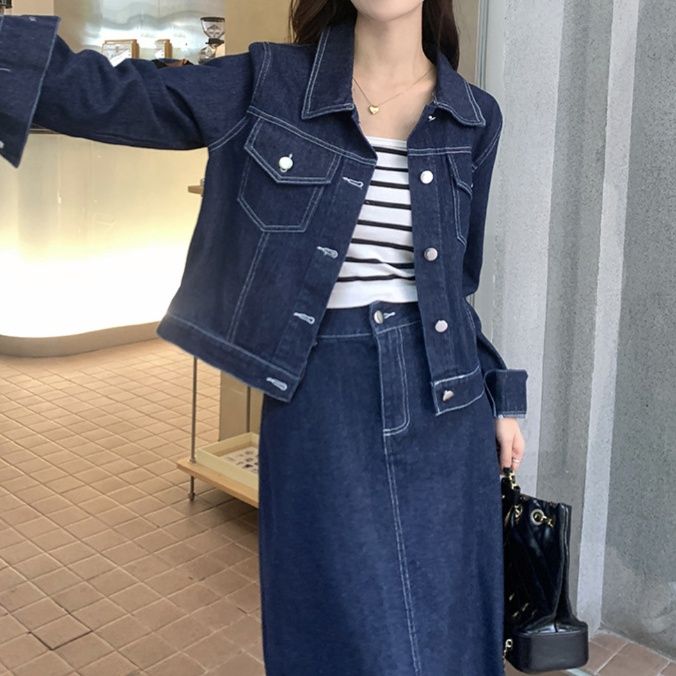 ジャケットとスカートの組み合わせが上品で洗練された雰囲気を演出