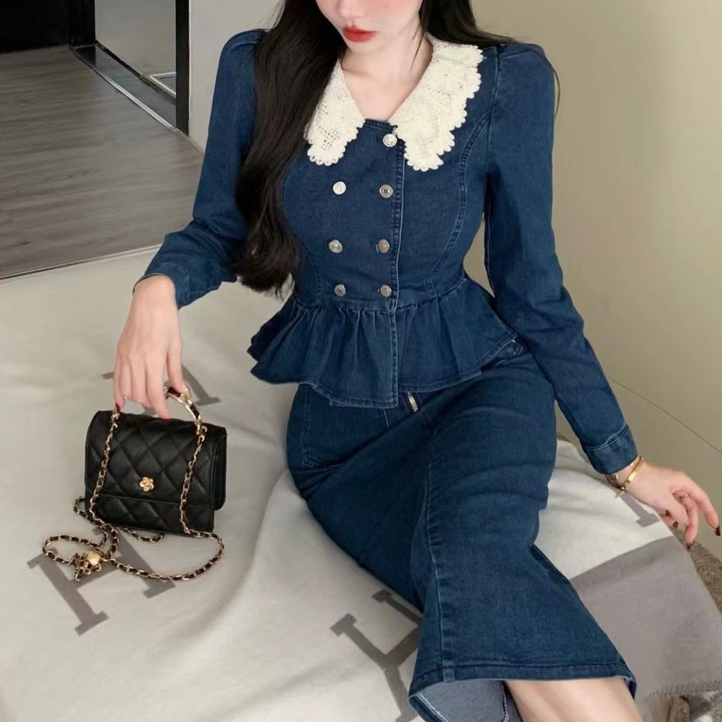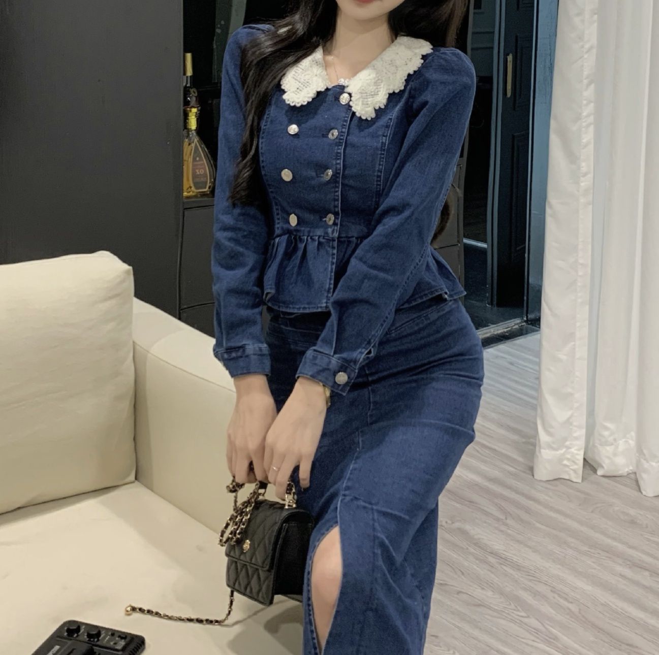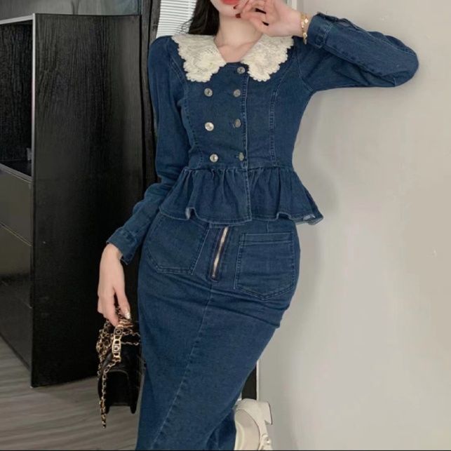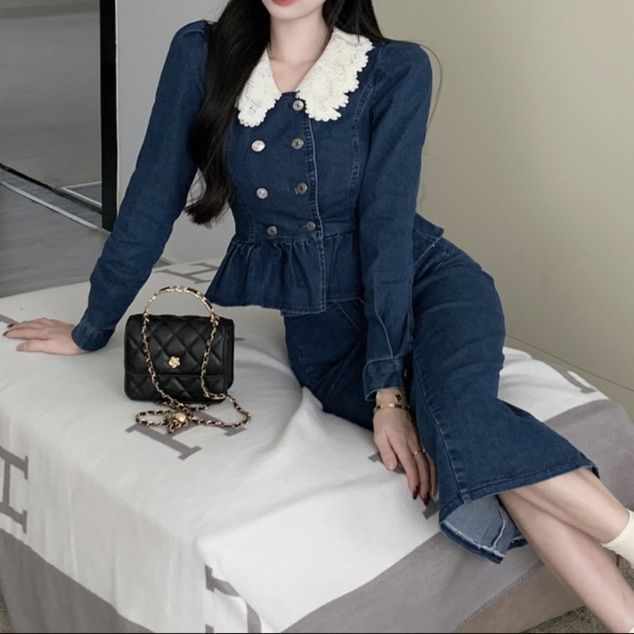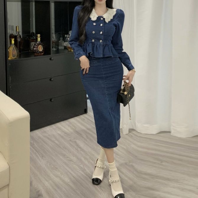 上品なレース襟とダブルボタンが特徴的なペプラムトップスと、タイトシルエットのミディ丈スカートのデニムセットアップです。