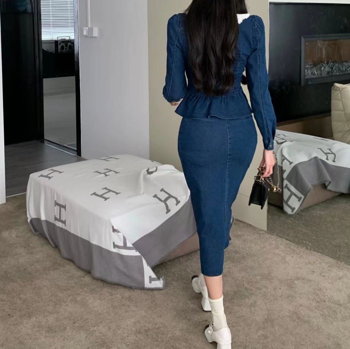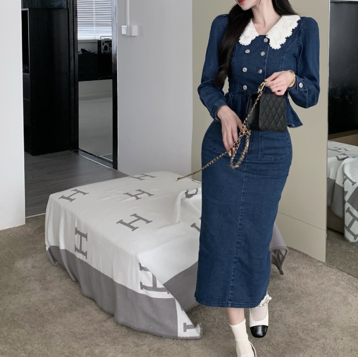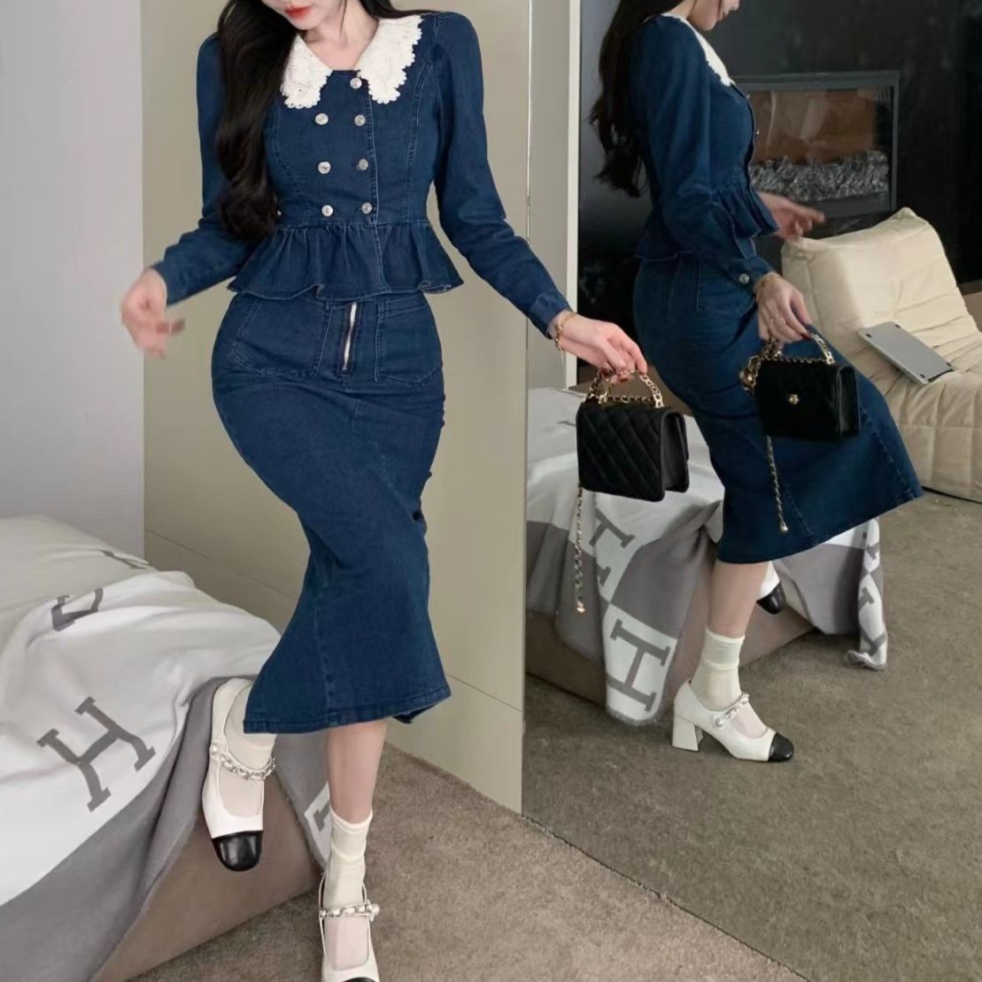 上品なレース襟とダブルボタンが特徴的なペプラムトップスと、タイトシルエットのミディ丈スカートのデニムセットアップです。