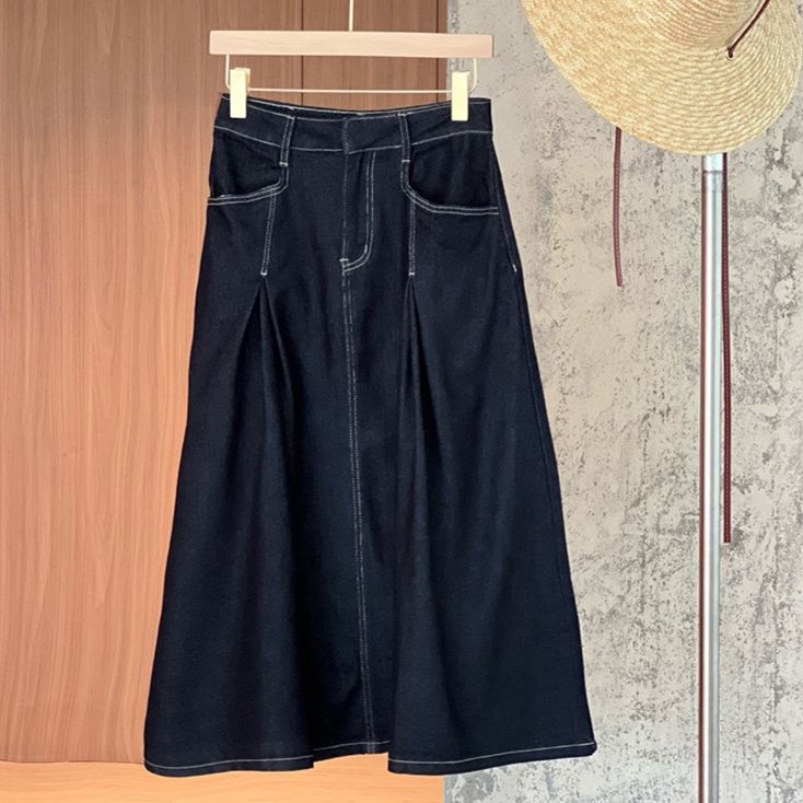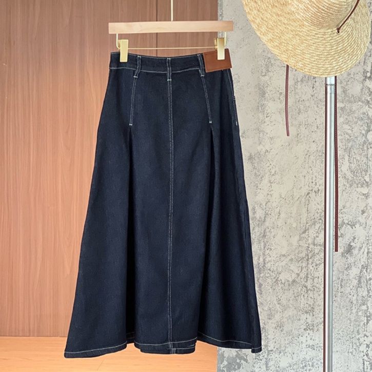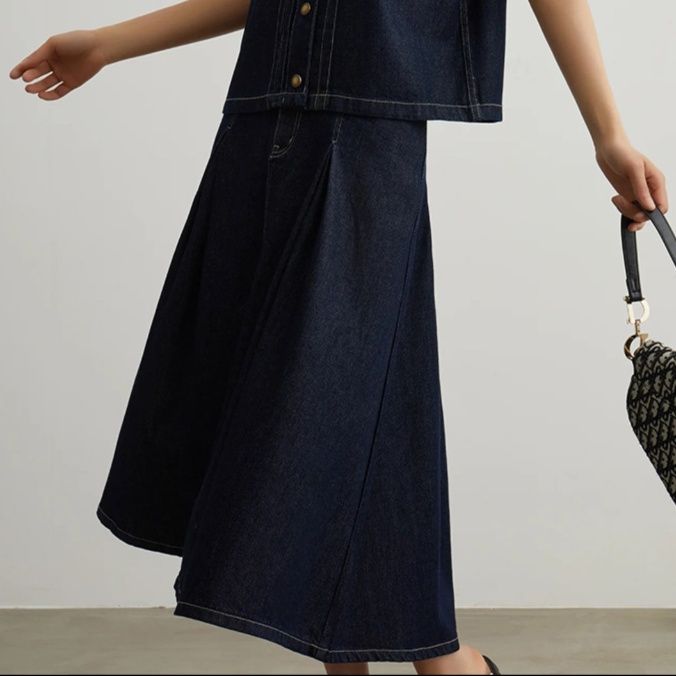 デニムセットアップの洗練された印象を与えるスカートセットアップ。