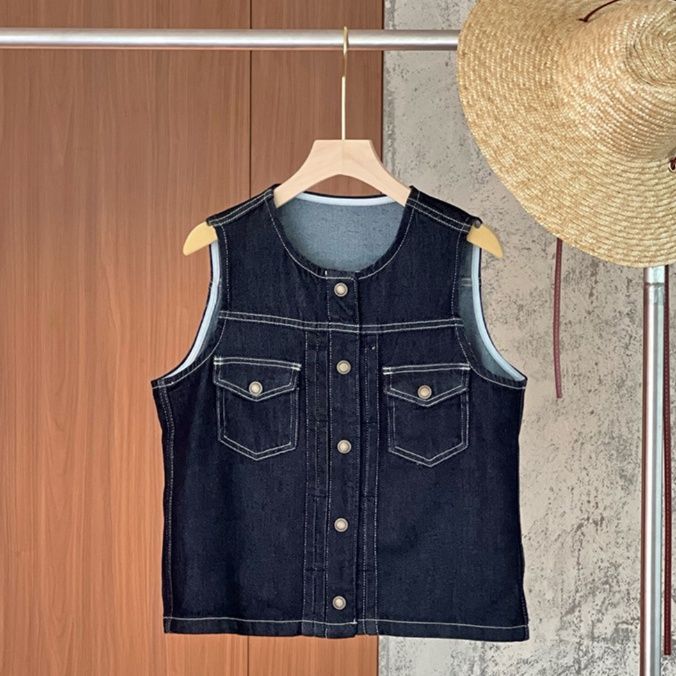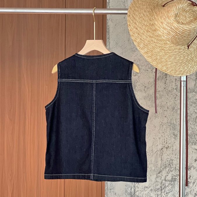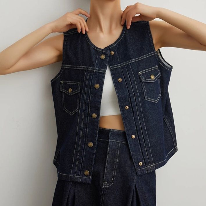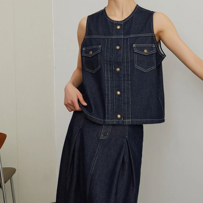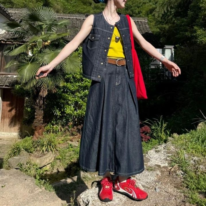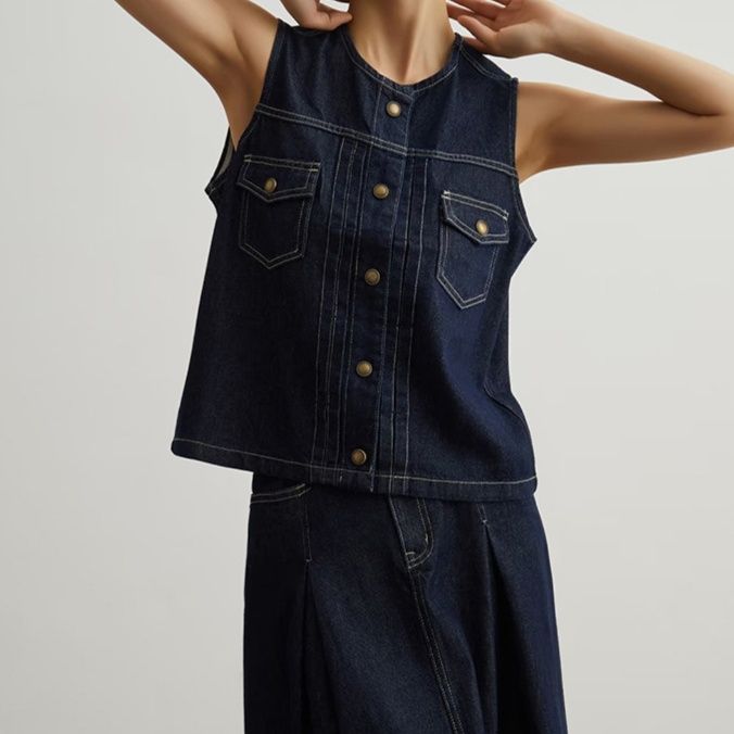 胸ポケット付きのノースリーブベストと上品な広がりのロングスカートが絶妙なバランスで組み合わされています。