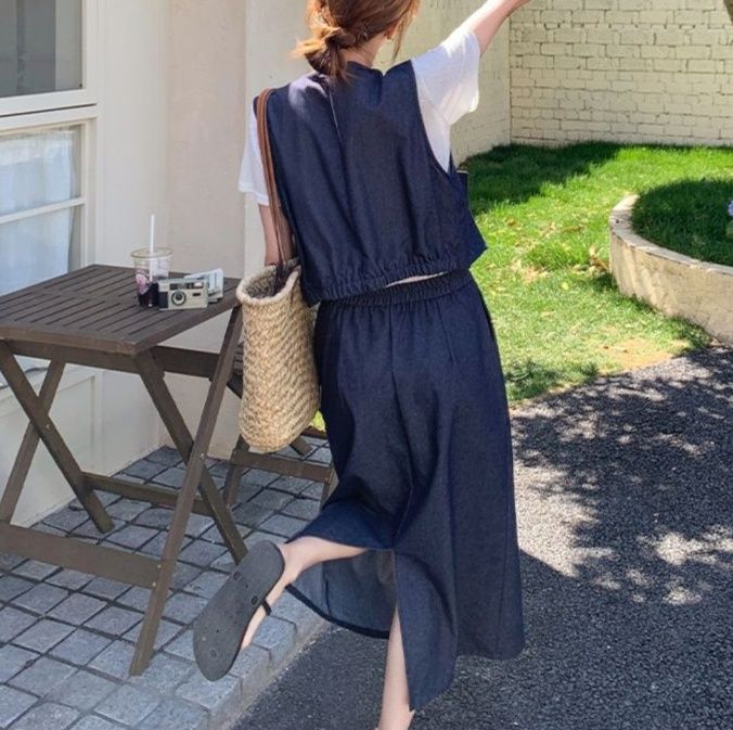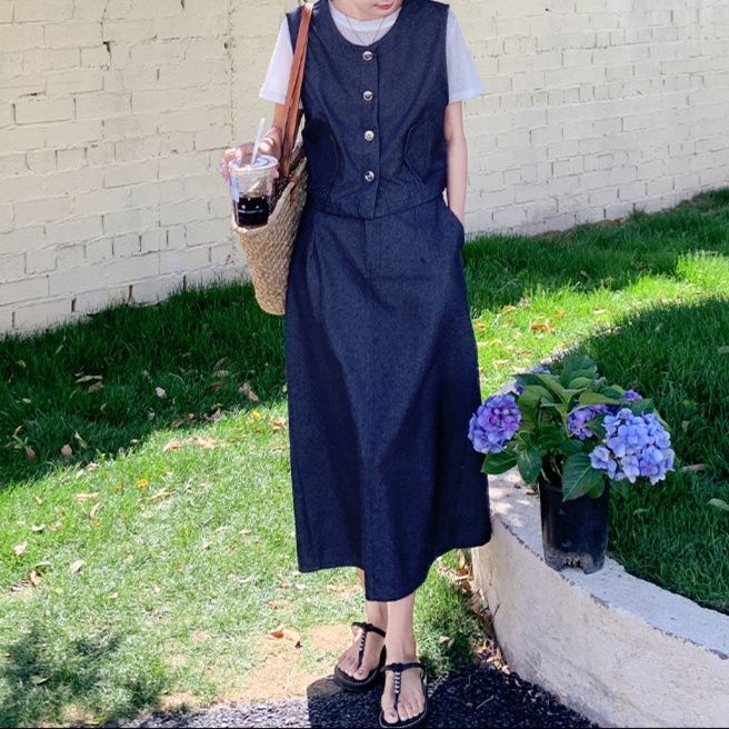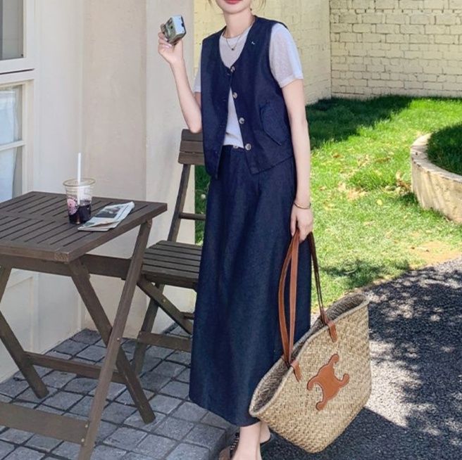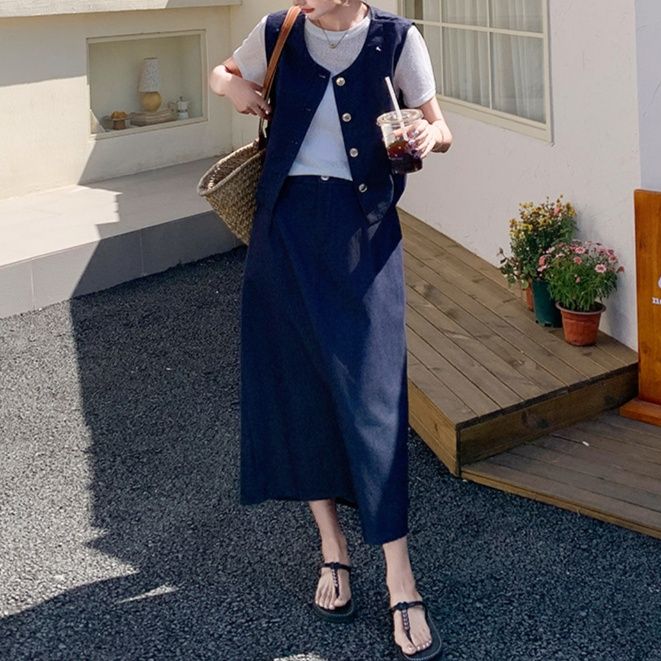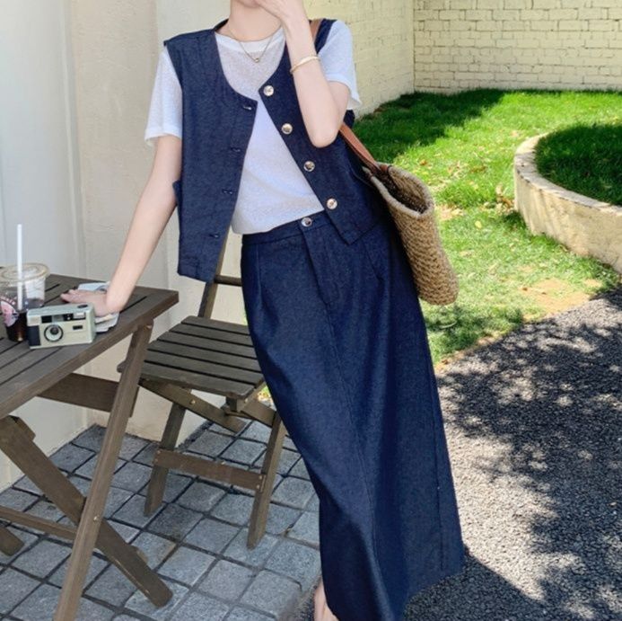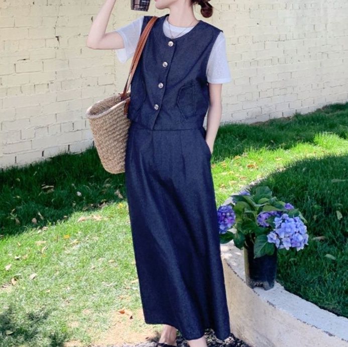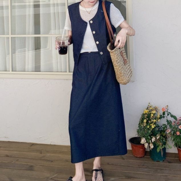 ボタン留めのノースリーブベストとTシャツ、ロングスカートが絶妙なバランスで馴染みます。