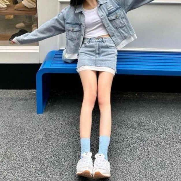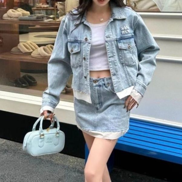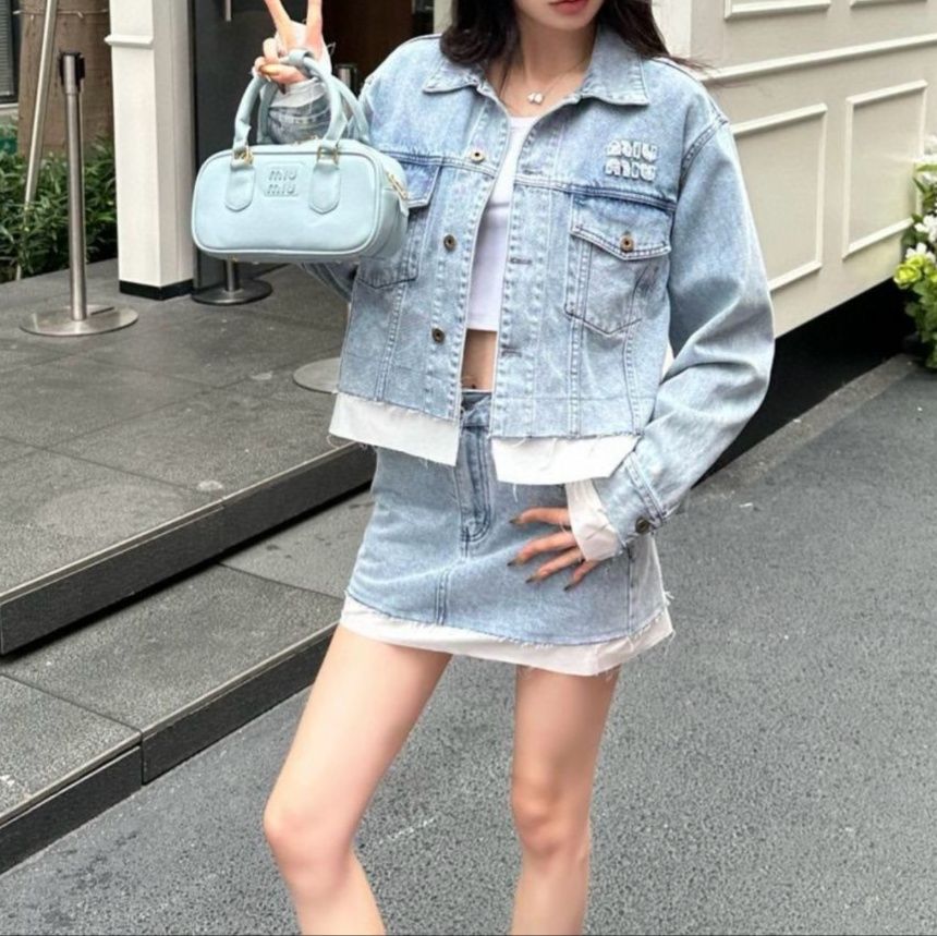 ゆったりとしたシルエットのジャケットとミニスカートが織りなす絶妙なバランスのデニムセットアップ。