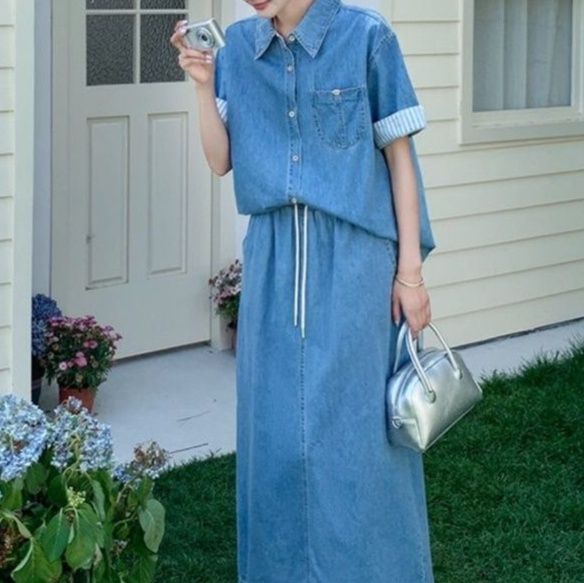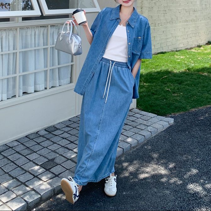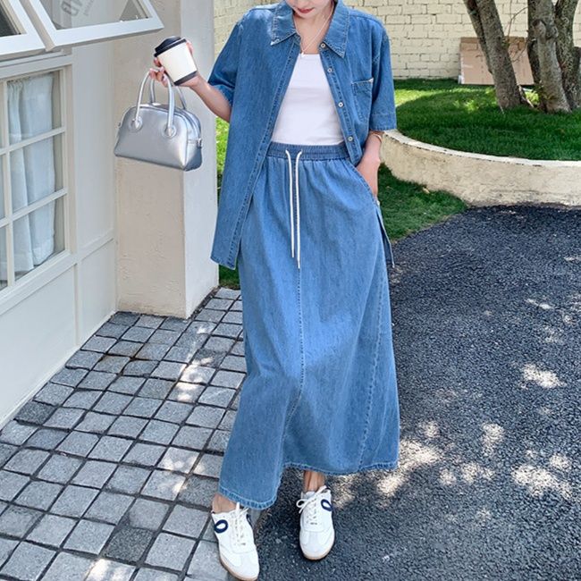 半袖のゆったりシャツと、紐付きウエストの快適なロングスカートの組み合わせが日常使いに最適です。